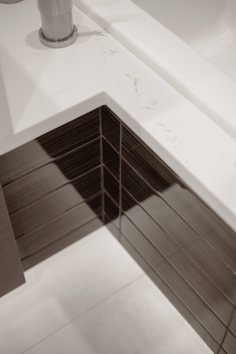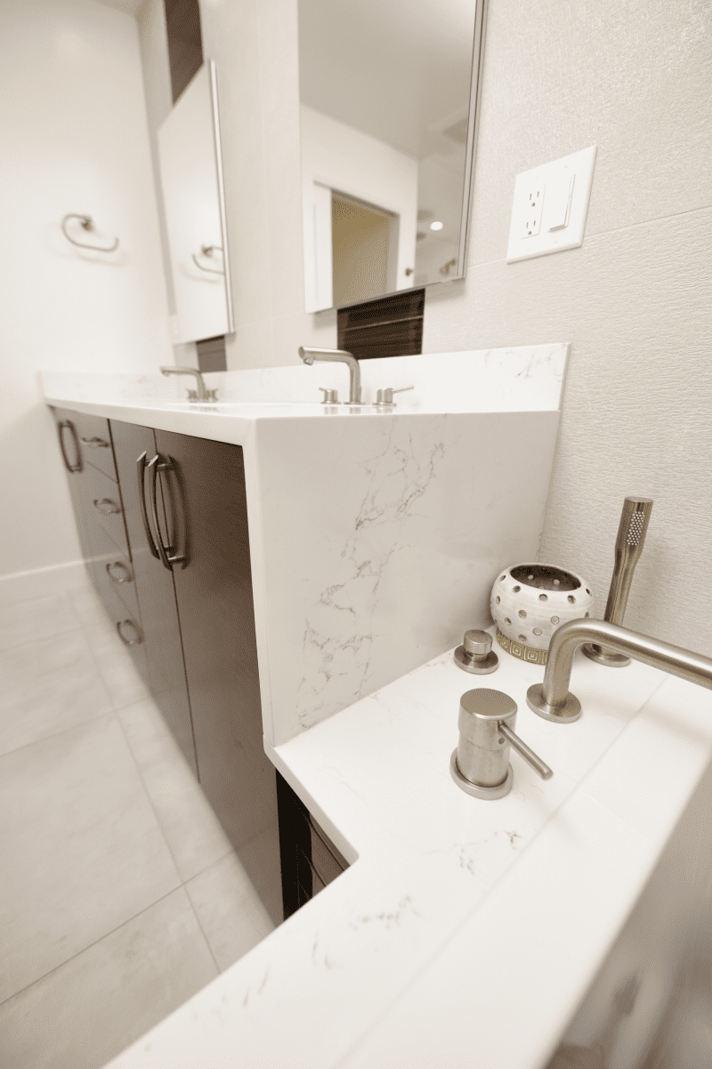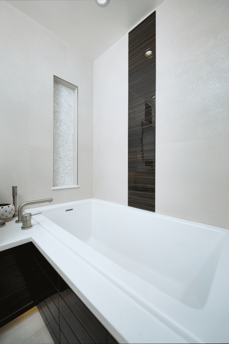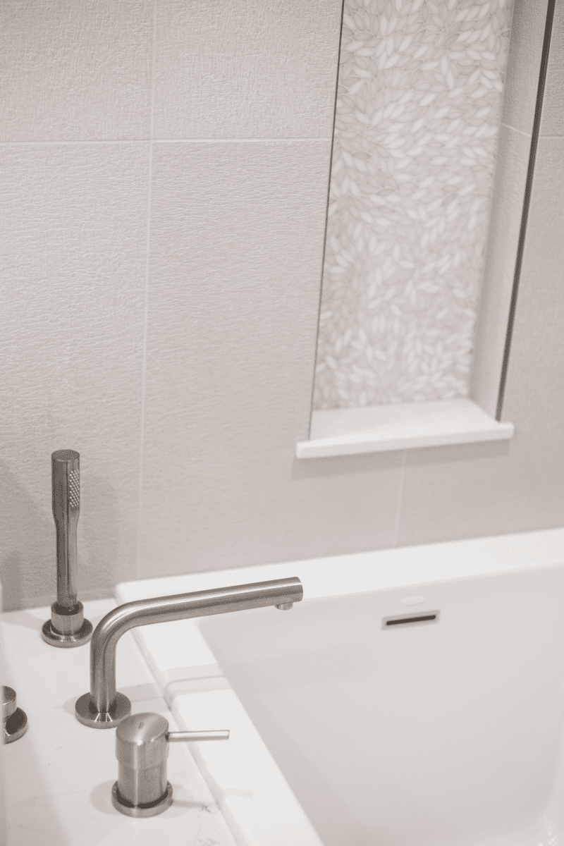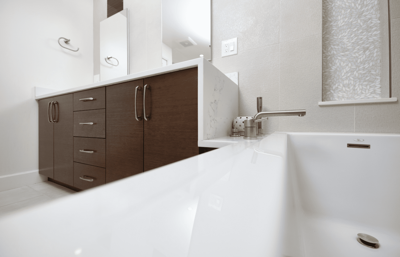 Bathroom remodel embraces a spacious and minimalist design, featuring light tones contrasted by rich brown accent cabinets. The natural light-colored stone countertop adds an organic touch, while the bathroom seamlessly blends both a bathtub and a shower. The shower floor is adorned with textured tiles that evoke the sensation of standing on pebbles by the seaside, enhancing the space’s tranquility. A decorative tile with a leaf pattern introduces a subtle yet distinctive flair, adding character and depth to this serene retreat.