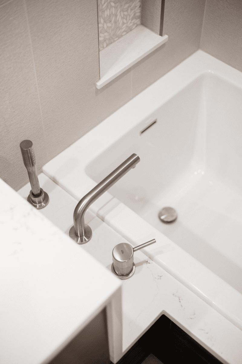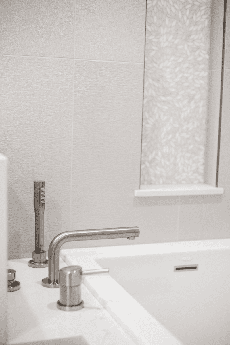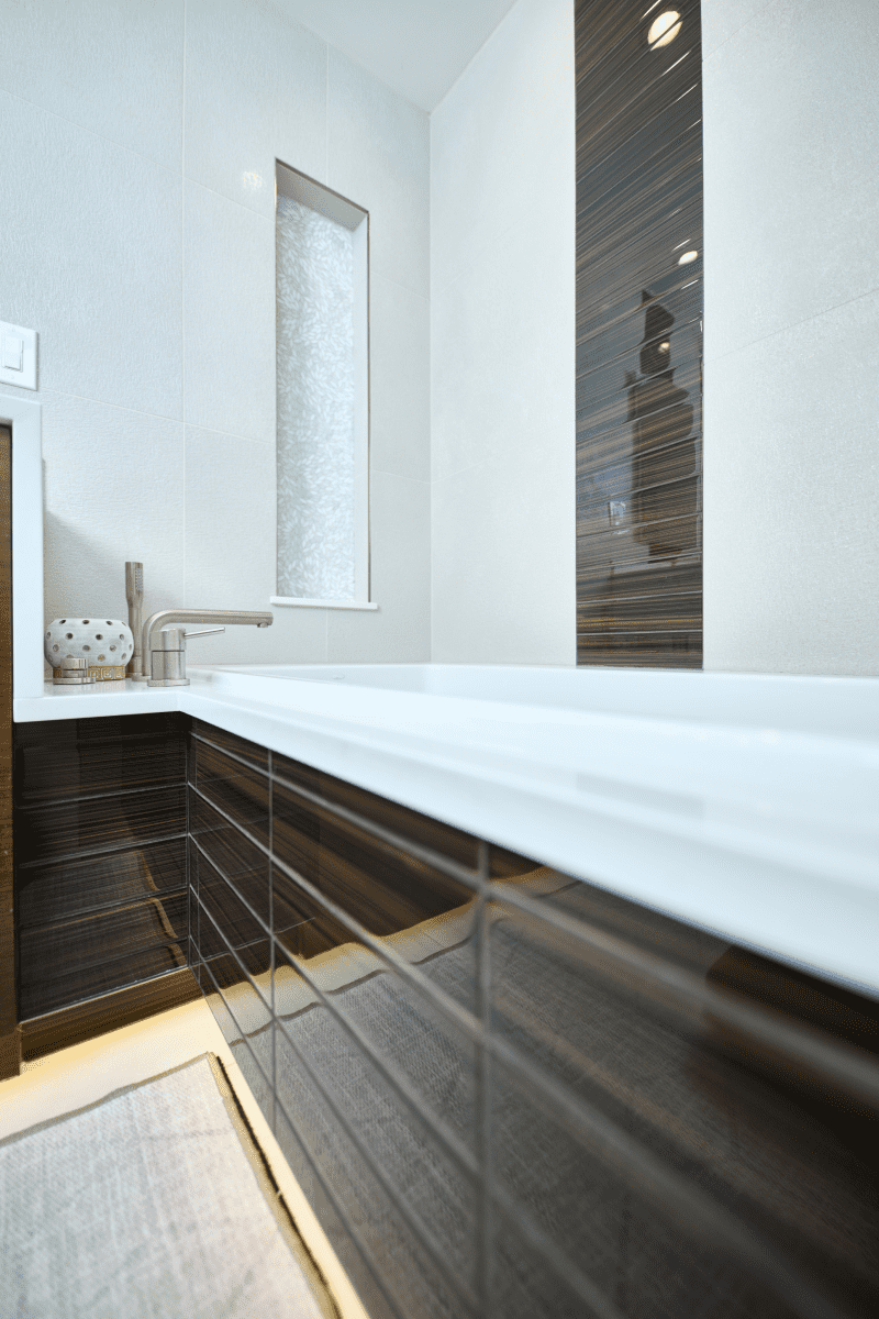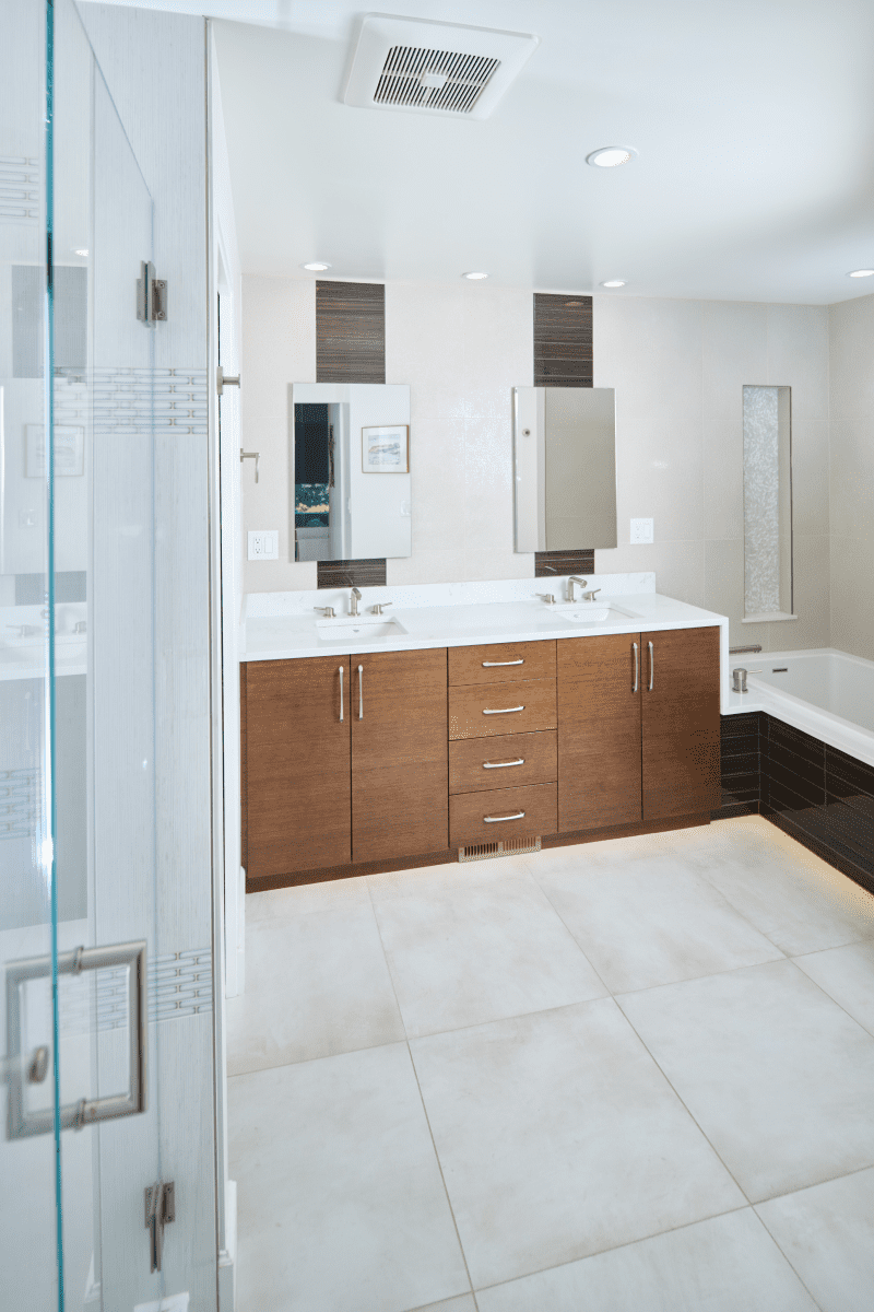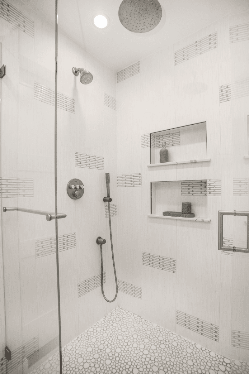 Bathroom remodel embraces a spacious and minimalist design, featuring light tones contrasted by rich brown accent cabinets. The natural light-colored stone countertop adds an organic touch, while the bathroom seamlessly blends both a bathtub and a shower. The shower floor is adorned with textured tiles that evoke the sensation of standing on pebbles by the seaside, enhancing the space’s tranquility. A decorative tile with a leaf pattern introduces a subtle yet distinctive flair, adding character and depth to this serene retreat.