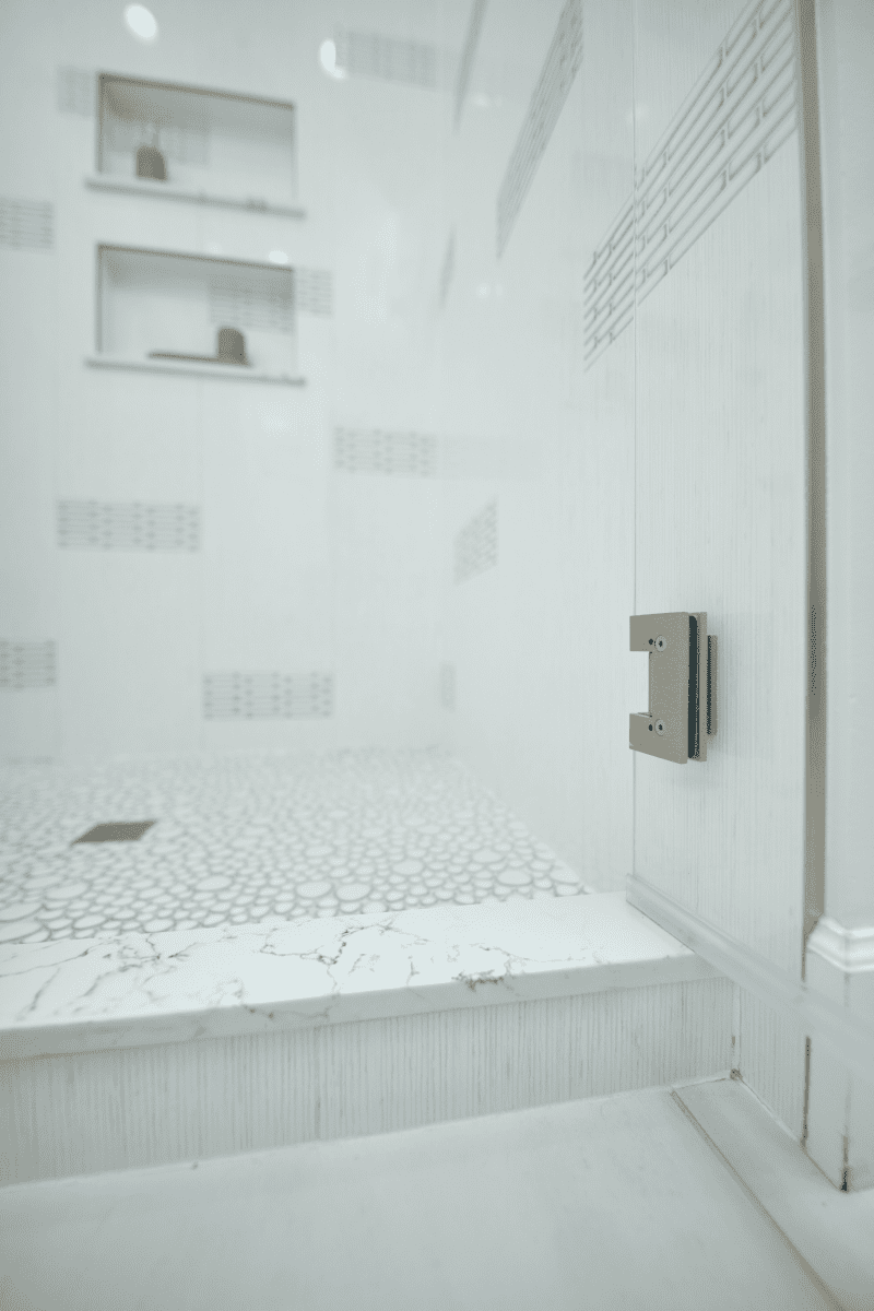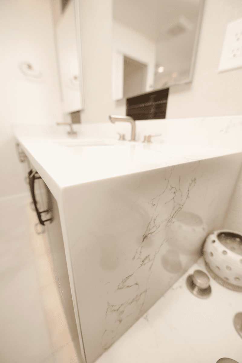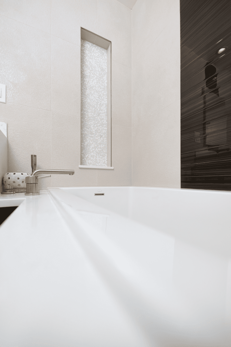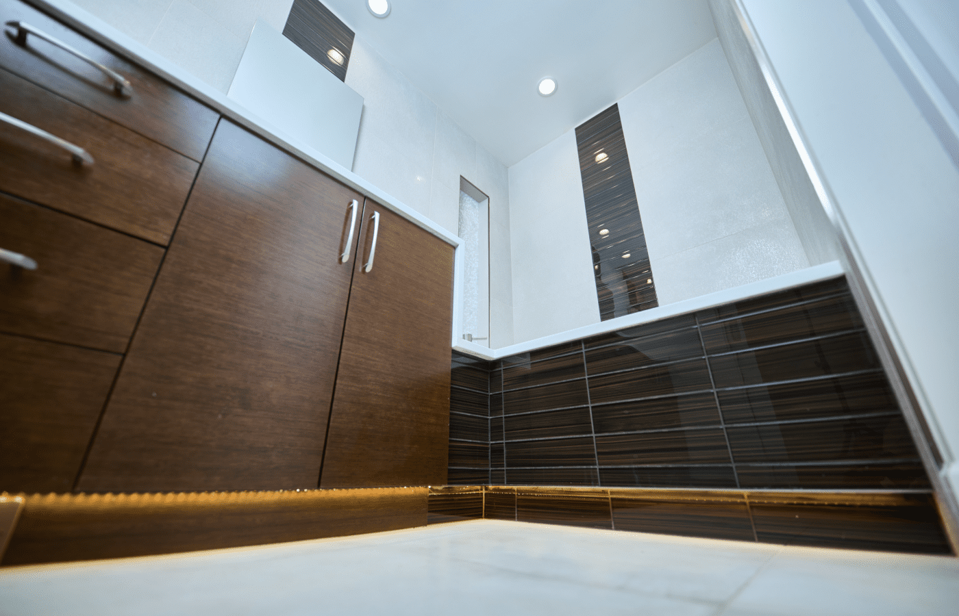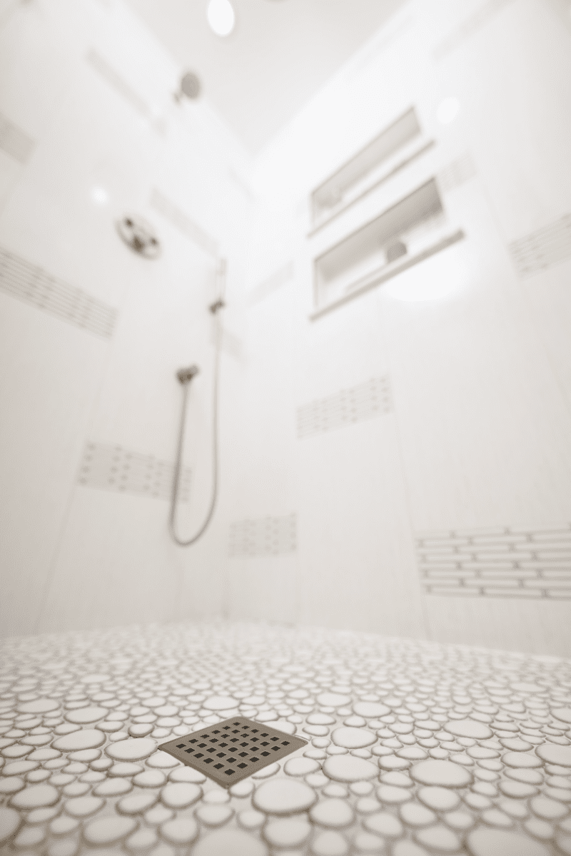 Bathroom remodel embraces a spacious and minimalist design, featuring light tones contrasted by rich brown accent cabinets. The natural light-colored stone countertop adds an organic touch, while the bathroom seamlessly blends both a bathtub and a shower. The shower floor is adorned with textured tiles that evoke the sensation of standing on pebbles by the seaside, enhancing the space’s tranquility. A decorative tile with a leaf pattern introduces a subtle yet distinctive flair, adding character and depth to this serene retreat.