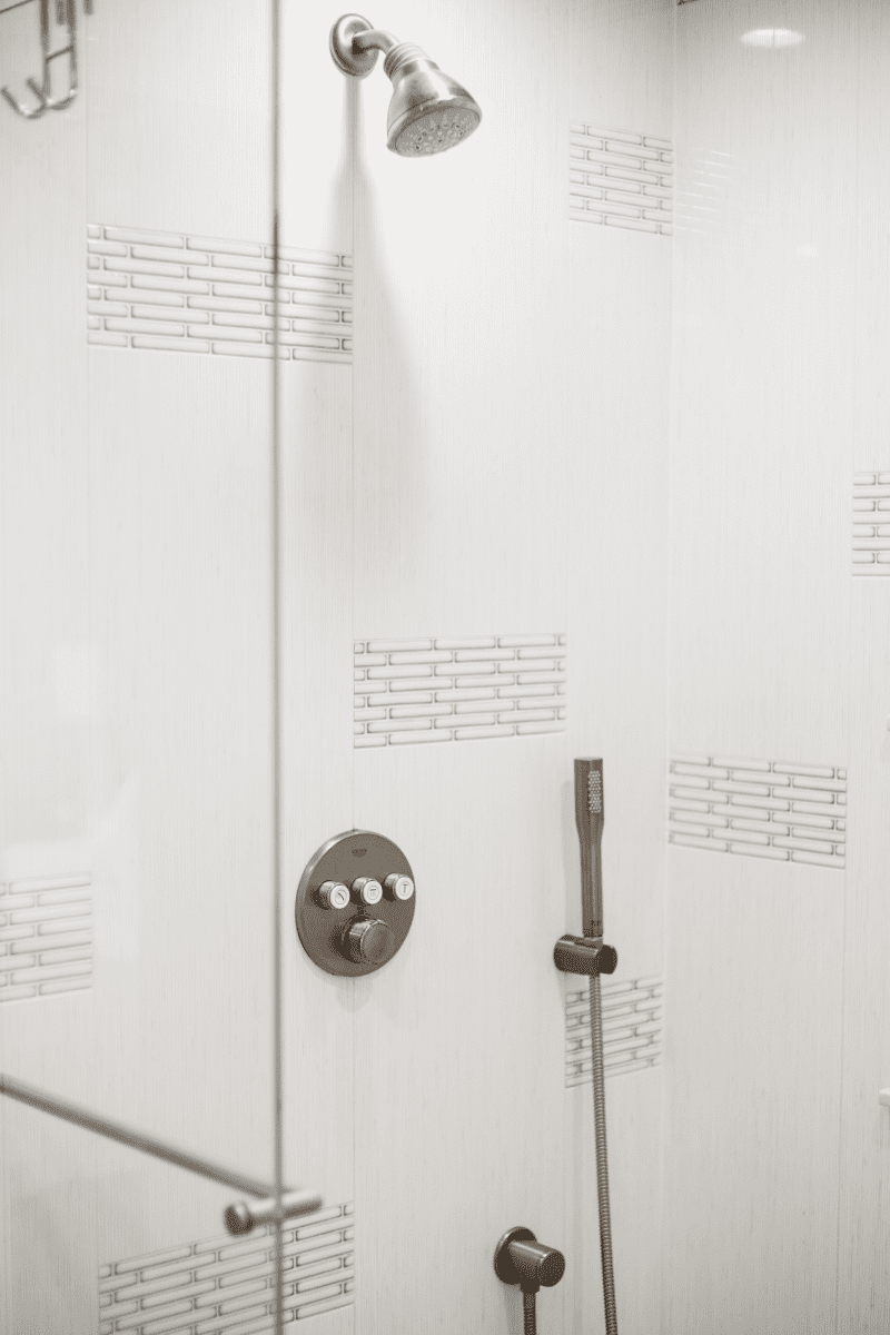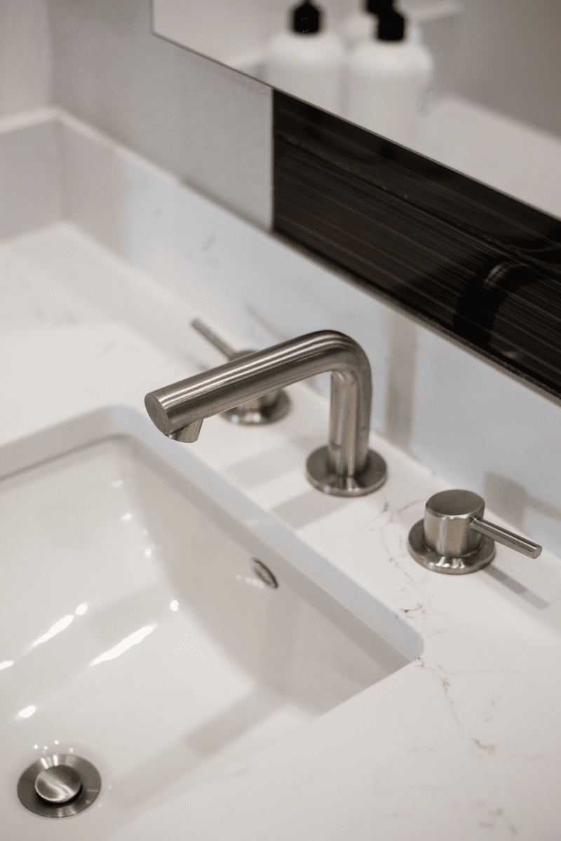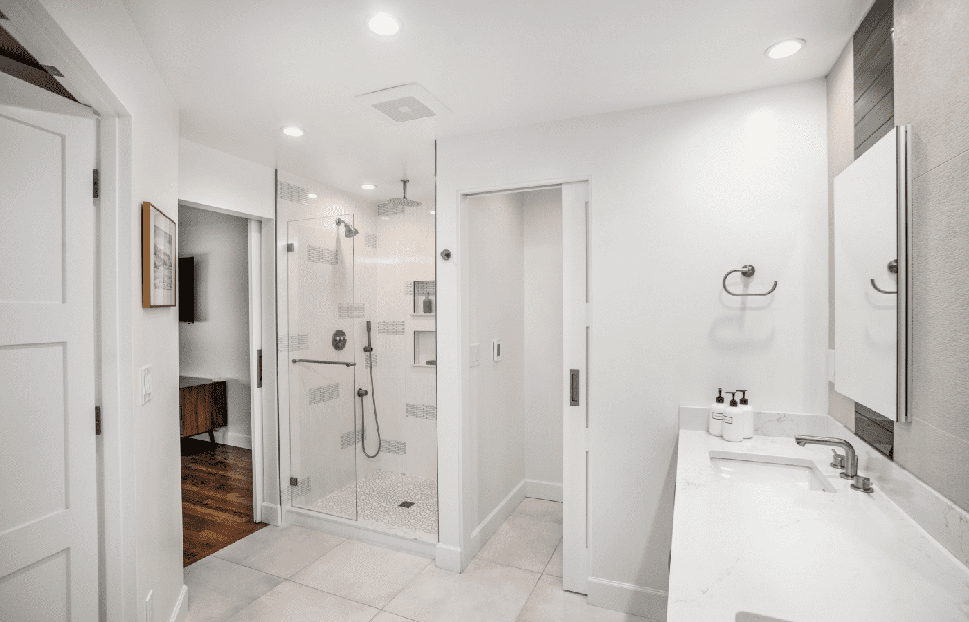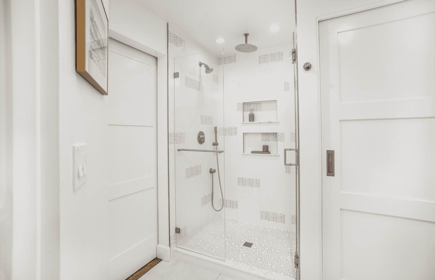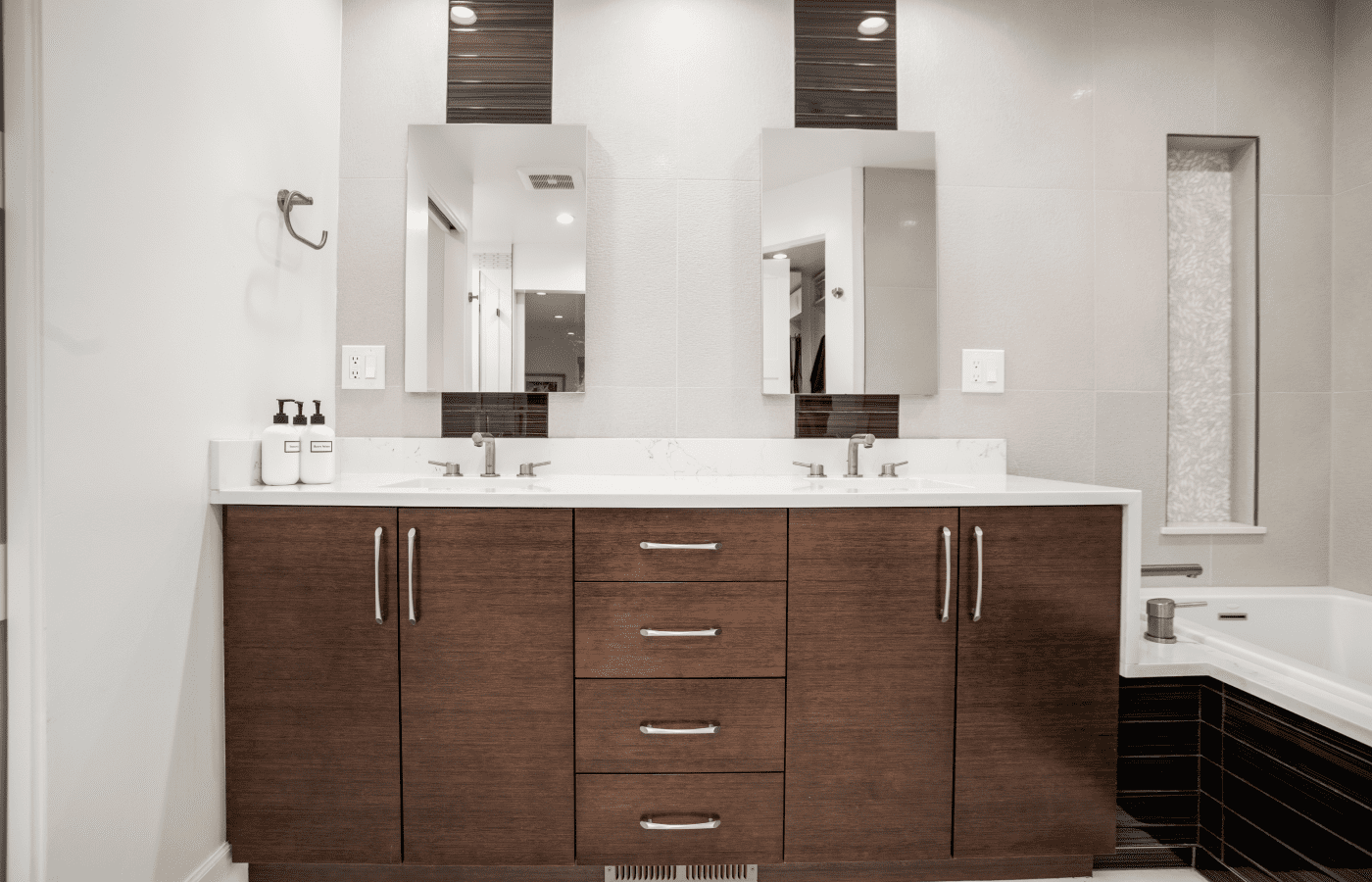 Bathroom remodel embraces a spacious and minimalist design, featuring light tones contrasted by rich brown accent cabinets. The natural light-colored stone countertop adds an organic touch, while the bathroom seamlessly blends both a bathtub and a shower. The shower floor is adorned with textured tiles that evoke the sensation of standing on pebbles by the seaside, enhancing the space’s tranquility. A decorative tile with a leaf pattern introduces a subtle yet distinctive flair, adding character and depth to this serene retreat.