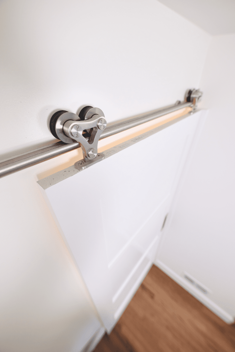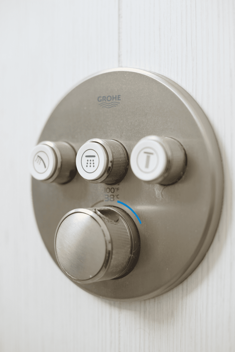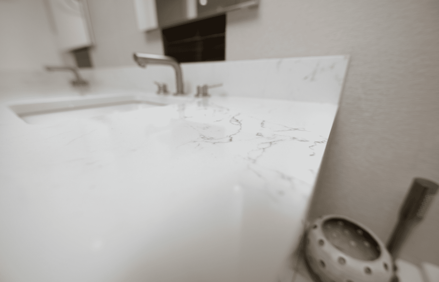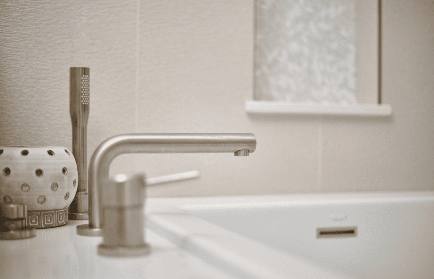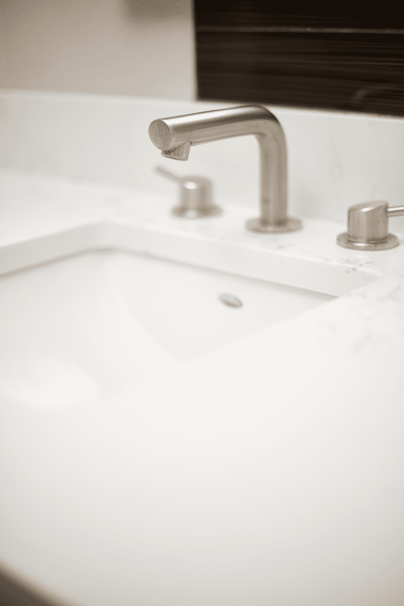 Bathroom remodel embraces a spacious and minimalist design, featuring light tones contrasted by rich brown accent cabinets. The natural light-colored stone countertop adds an organic touch, while the bathroom seamlessly blends both a bathtub and a shower. The shower floor is adorned with textured tiles that evoke the sensation of standing on pebbles by the seaside, enhancing the space’s tranquility. A decorative tile with a leaf pattern introduces a subtle yet distinctive flair, adding character and depth to this serene retreat.