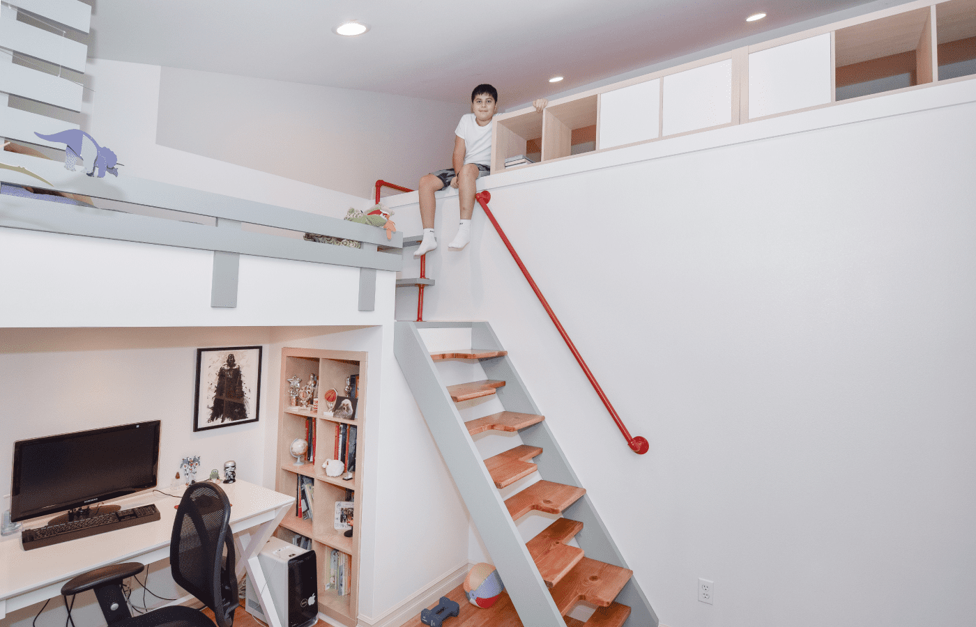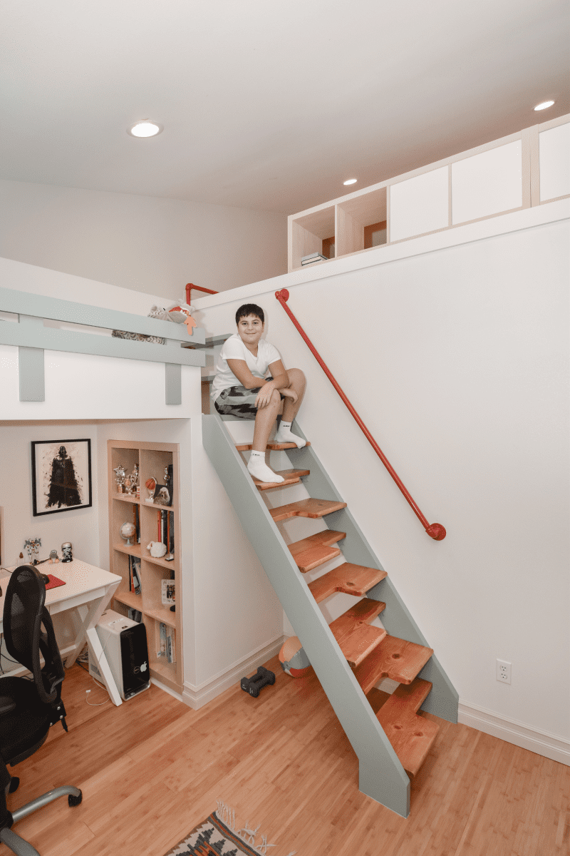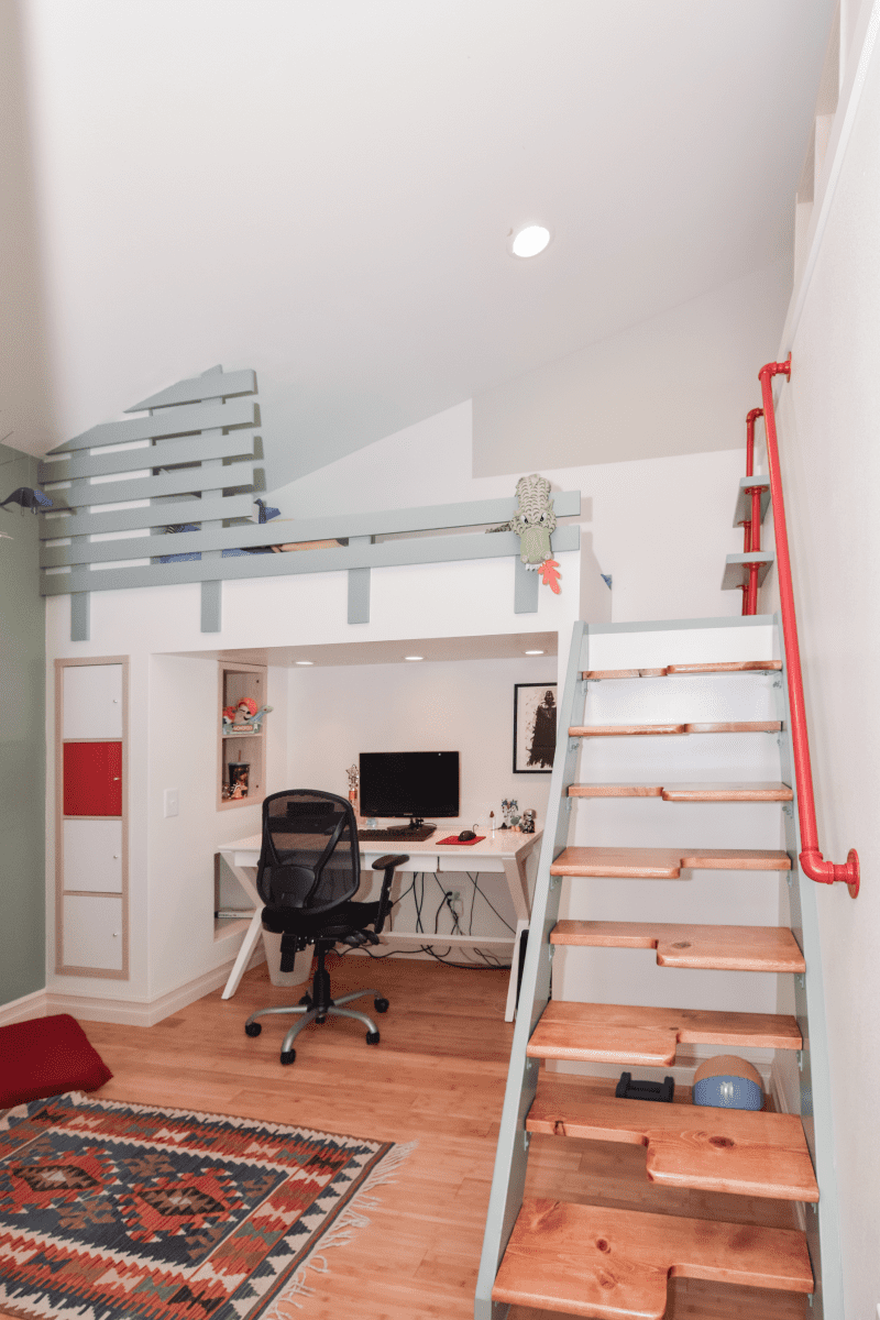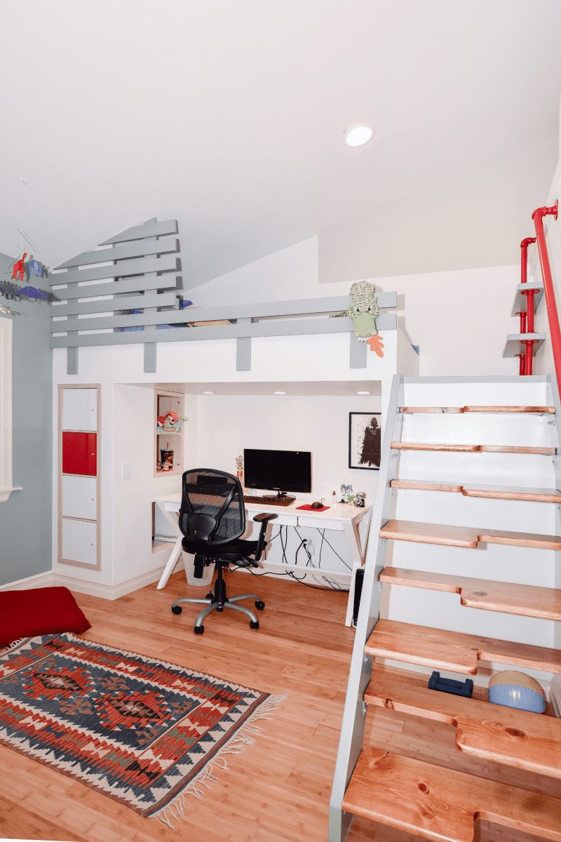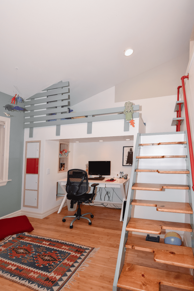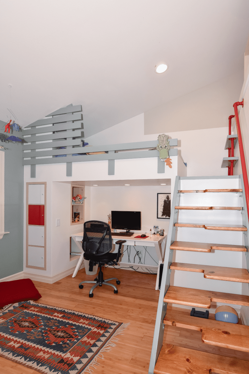 The children’s room remodeling project involved a complete reconfiguration of the space to create distinct areas for sports, relaxation, and a dedicated zone for computer work and studying. To achieve the goal of making the room both engaging and unique, we designed custom furniture pieces specifically for this project, crafted by MonstersToolbox. These custom elements not only maximize functionality but also add a playful and personalized touch to the room, making it a perfect environment for growth and creativity.