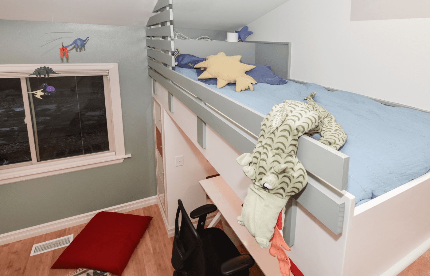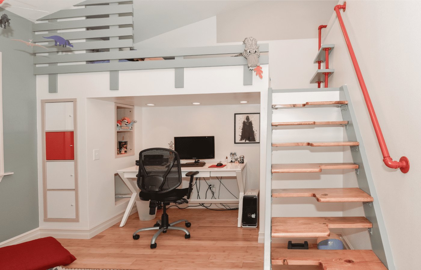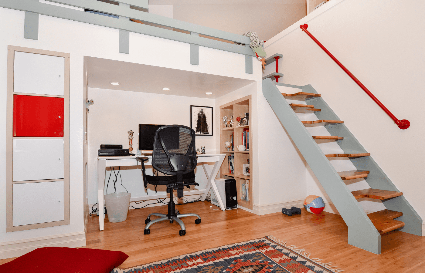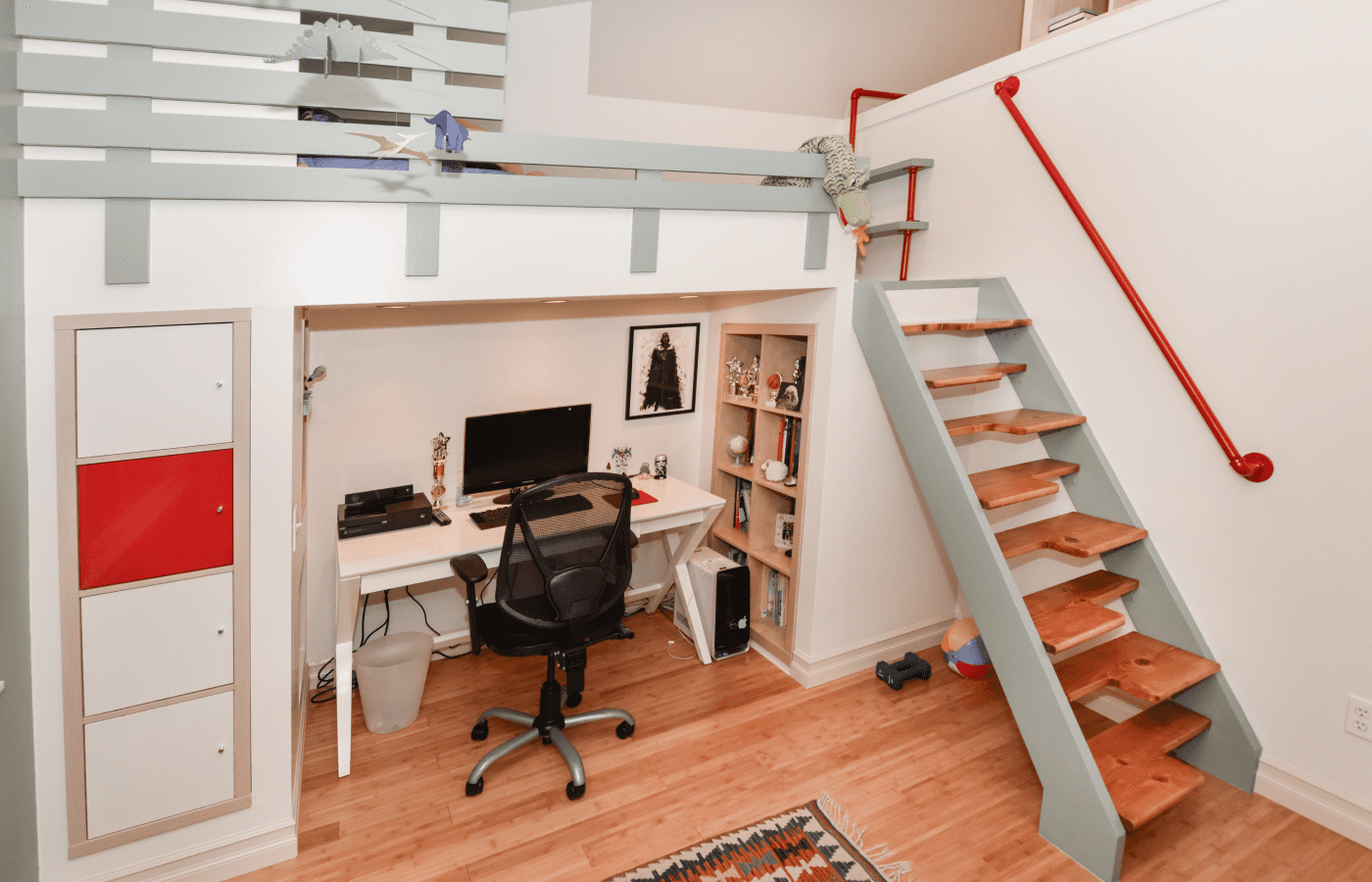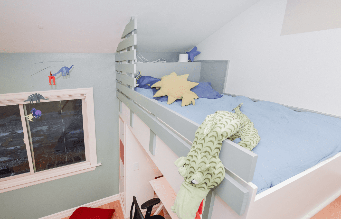 The children’s room remodeling project involved a complete reconfiguration of the space to create distinct areas for sports, relaxation, and a dedicated zone for computer work and studying. To achieve the goal of making the room both engaging and unique, we designed custom furniture pieces specifically for this project, crafted by MonstersToolbox. These custom elements not only maximize functionality but also add a playful and personalized touch to the room, making it a perfect environment for growth and creativity.