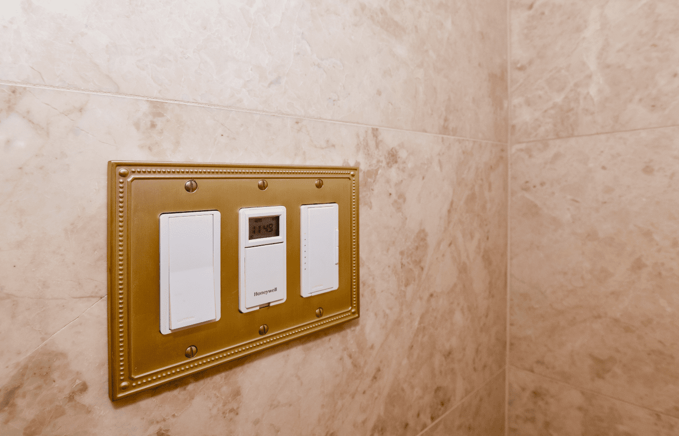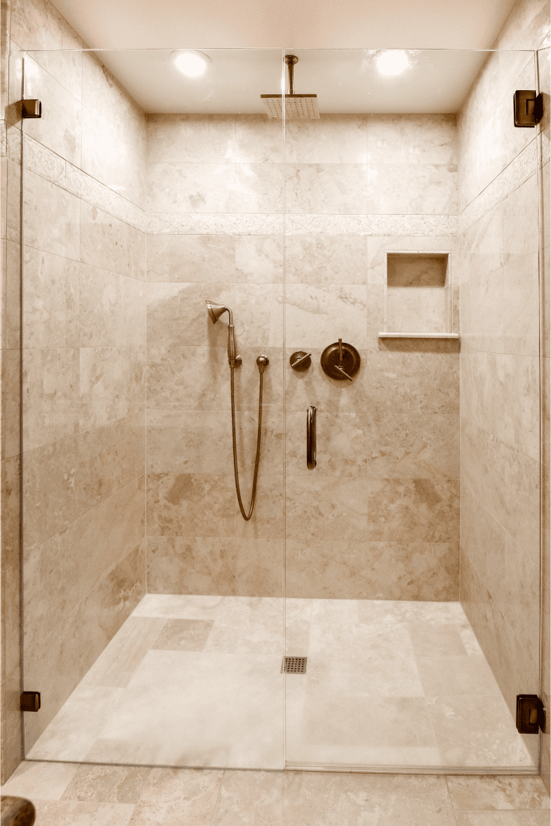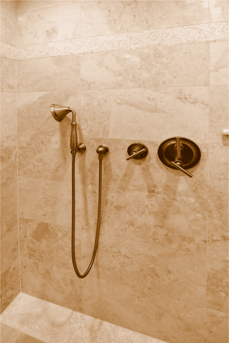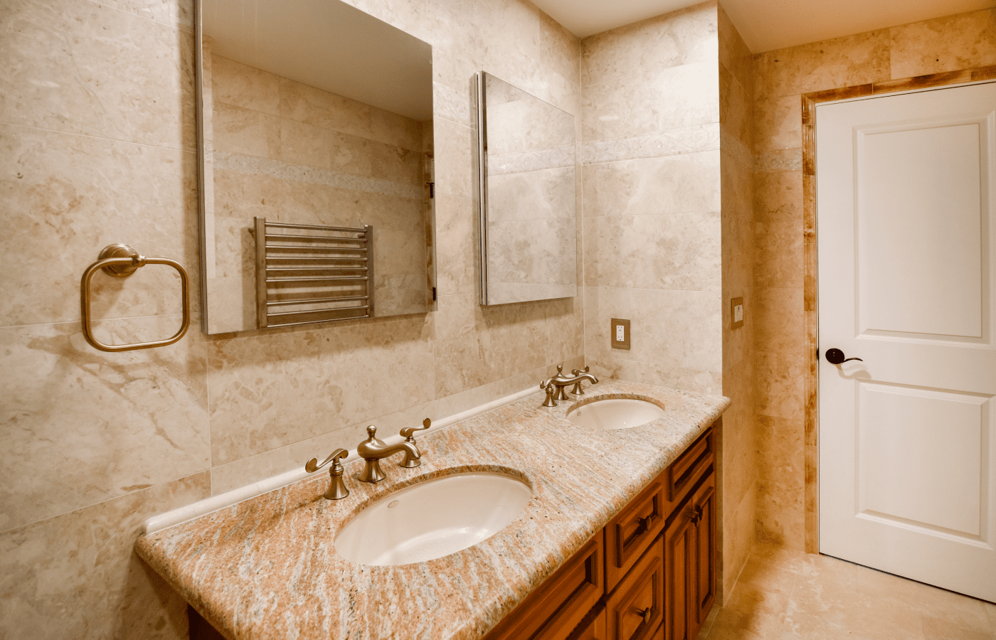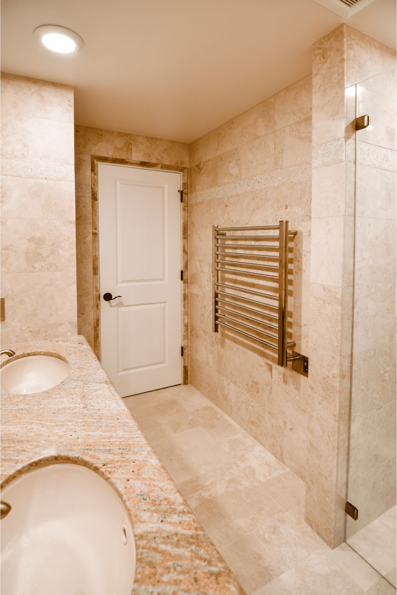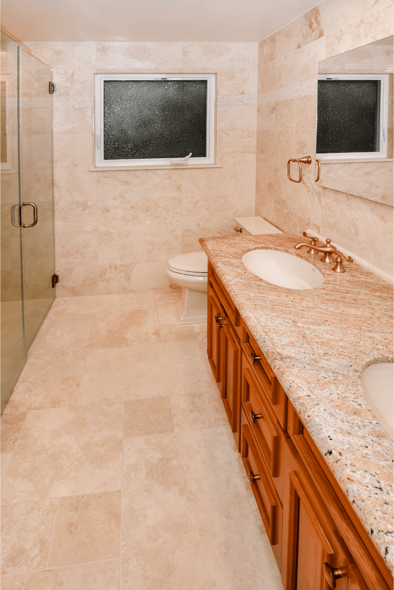 Bathroom remodel embraces warm, inviting tones, with tiles that perfectly mimic the texture and color of natural sand-colored stone. The countertop, crafted from natural stone, adds a touch of elegance, while the carefully selected details, including faucets, handles, and towel hooks, strictly adhere to a classic style, beautifully complementing the overall design.
