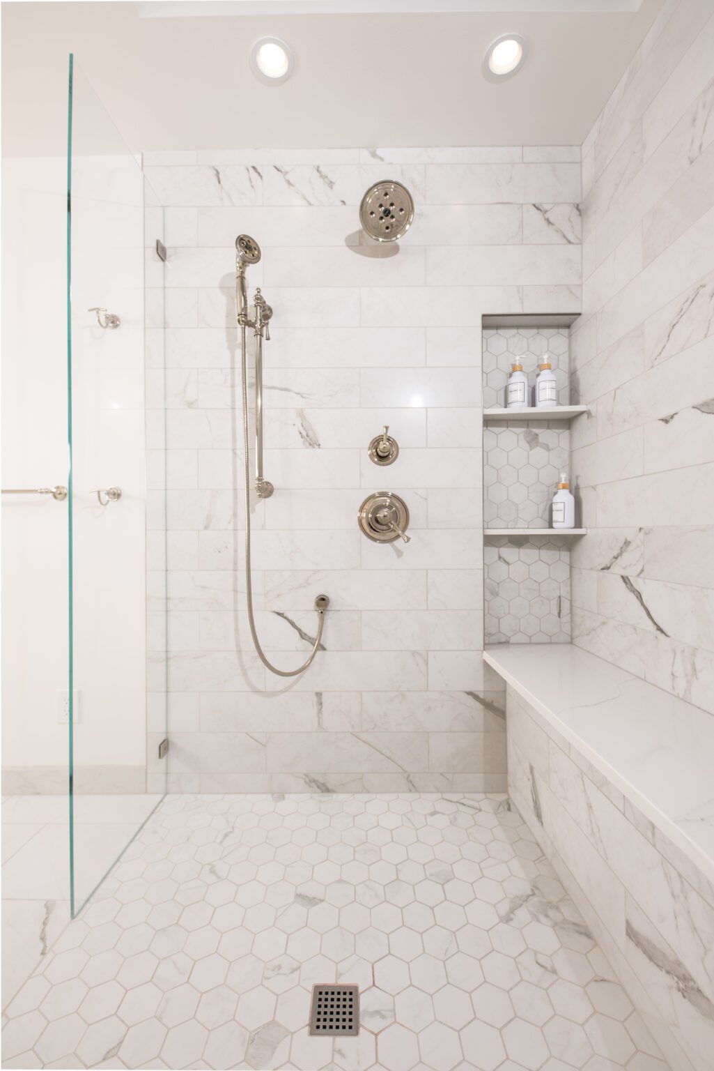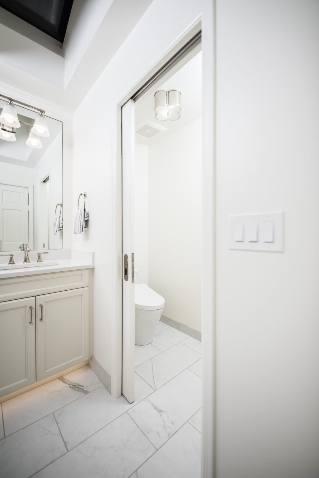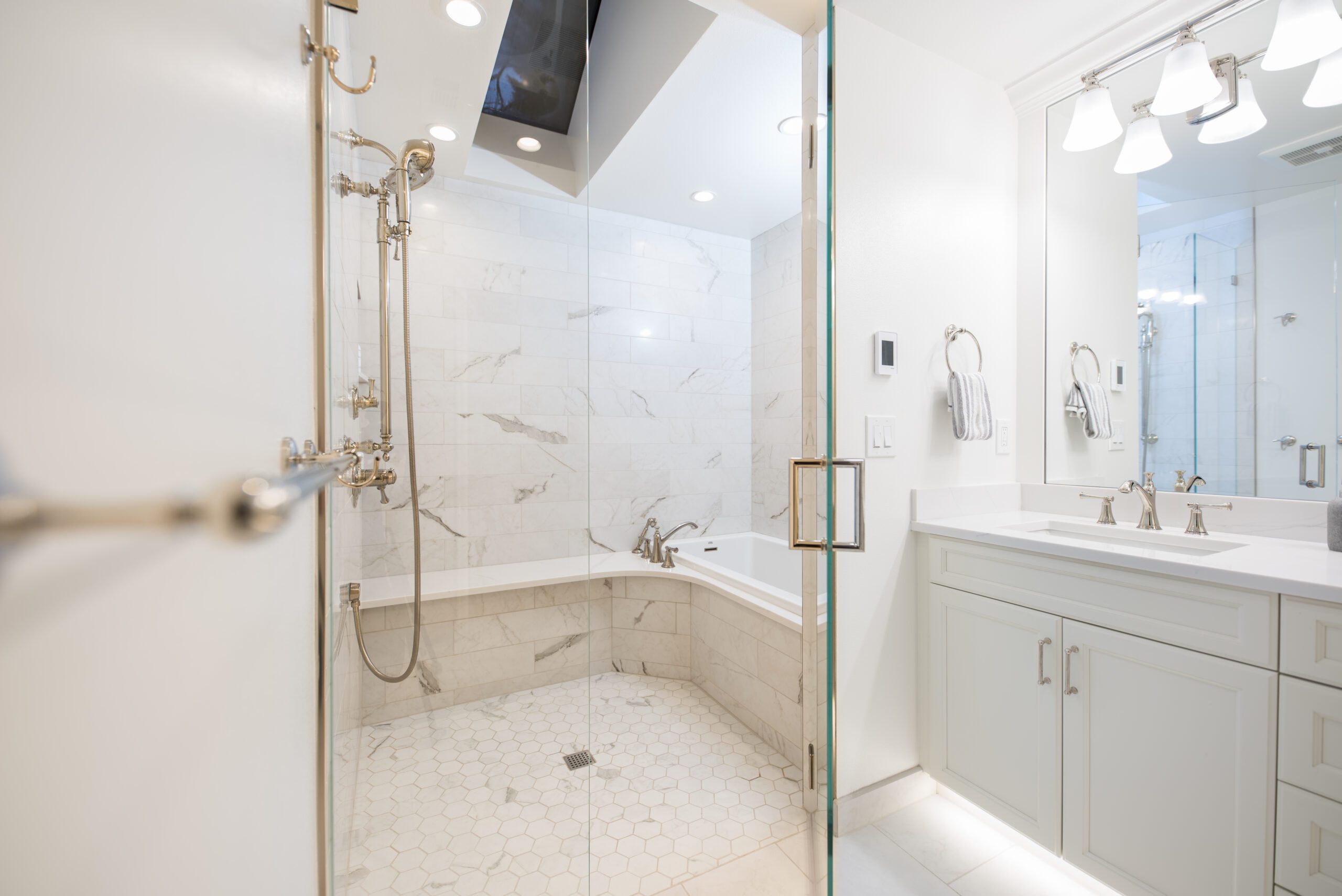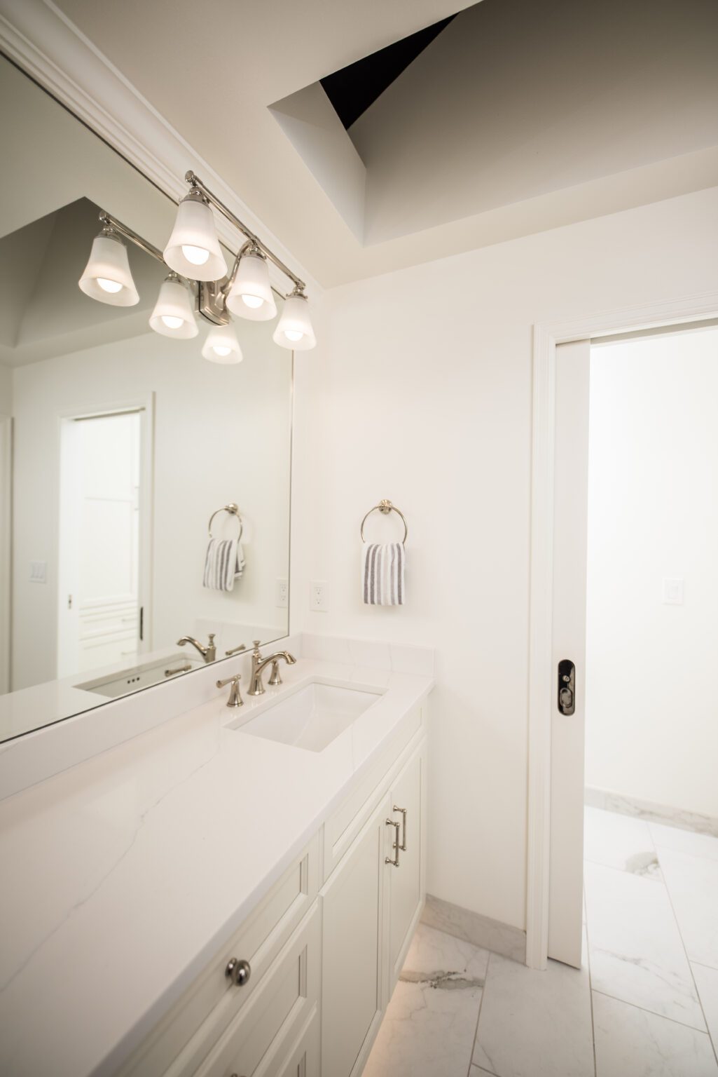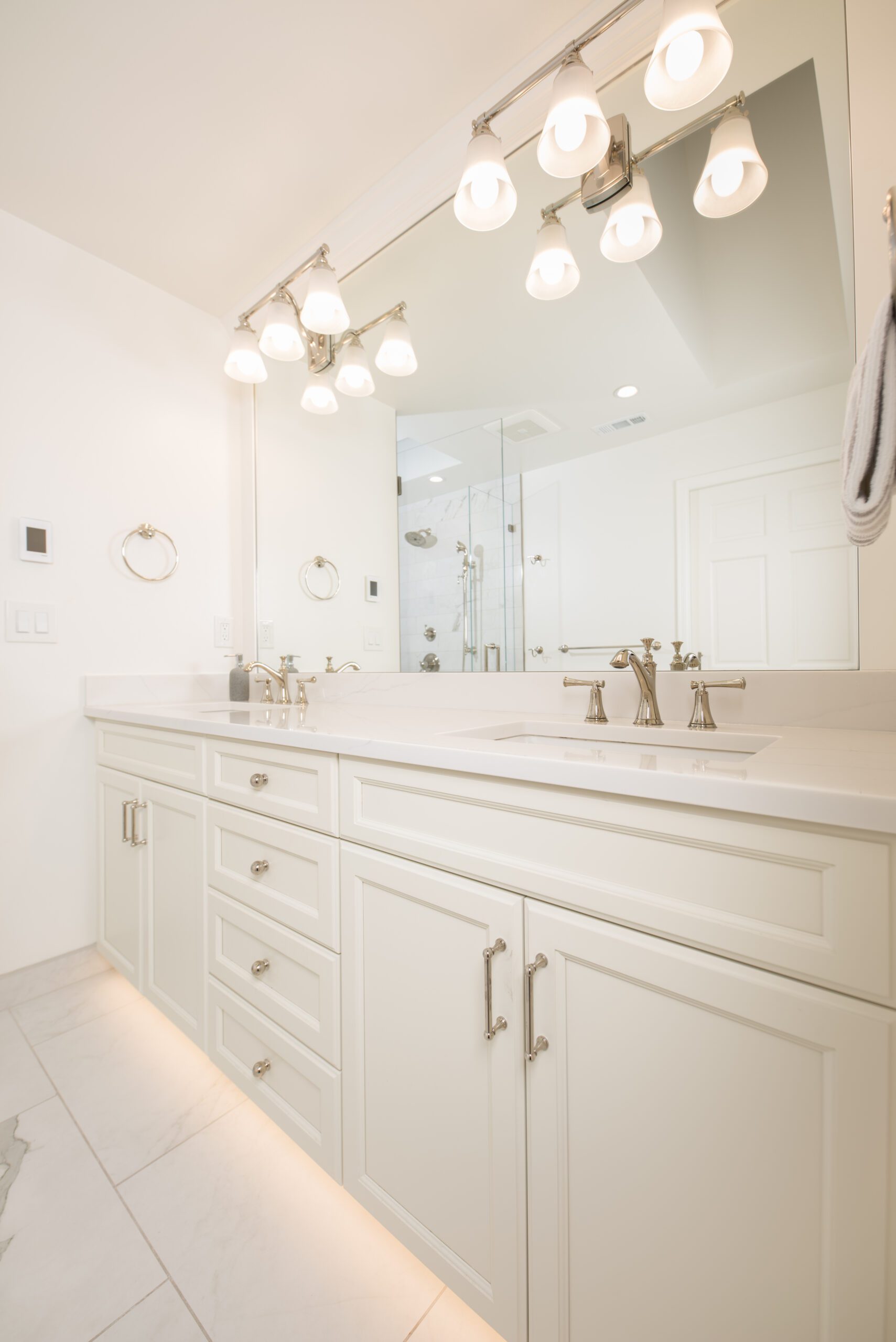 The bathroom remodeling project exemplifies modern elegance. Featuring Silestone countertops expertly fabricated and installed by Granite and Marble Specialties, this bathroom combines style and durability. Belmont cabinets offer practical and chic storage solutions, complemented by contemporary lighting fixtures from Modern Forms and Avenue Lighting.