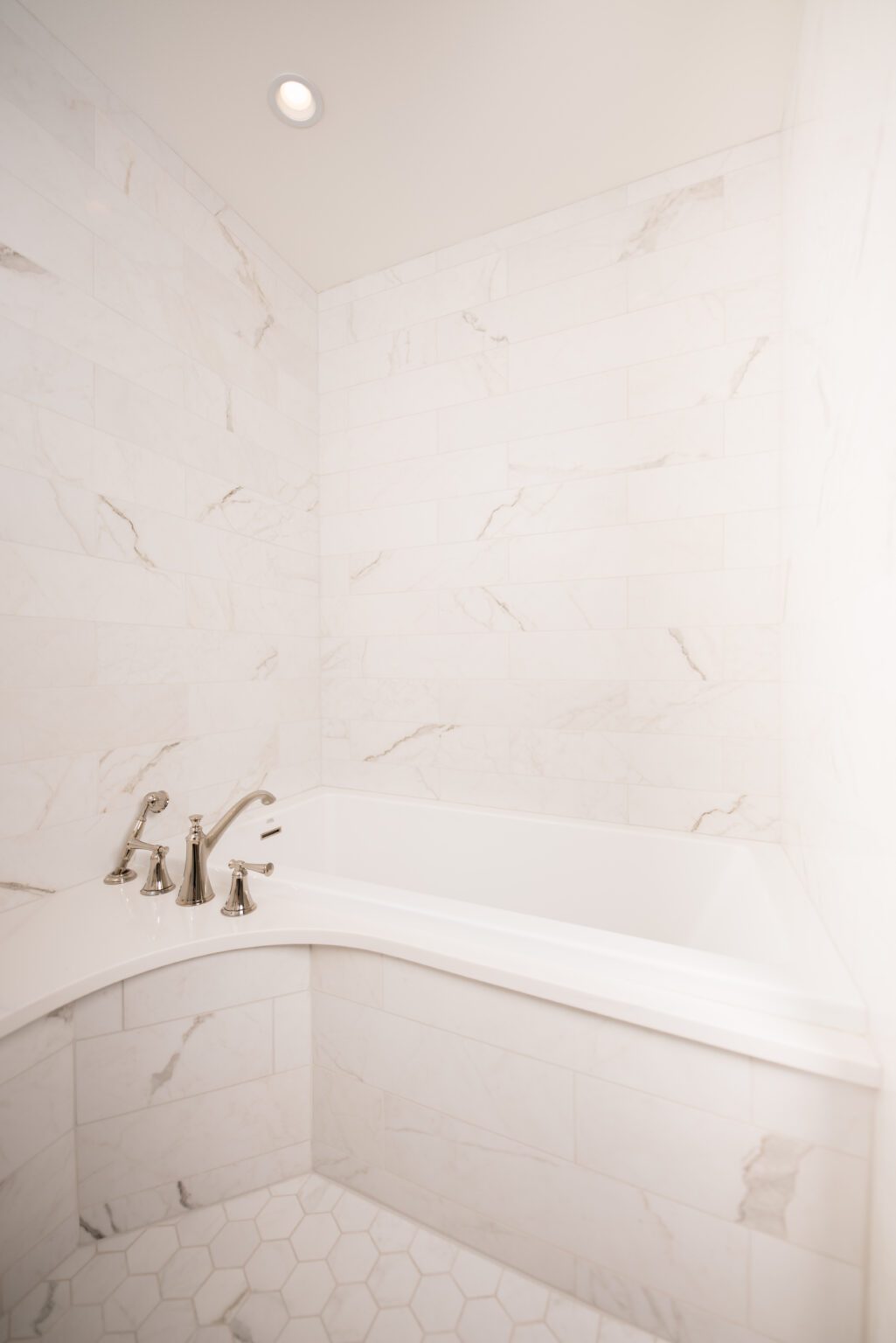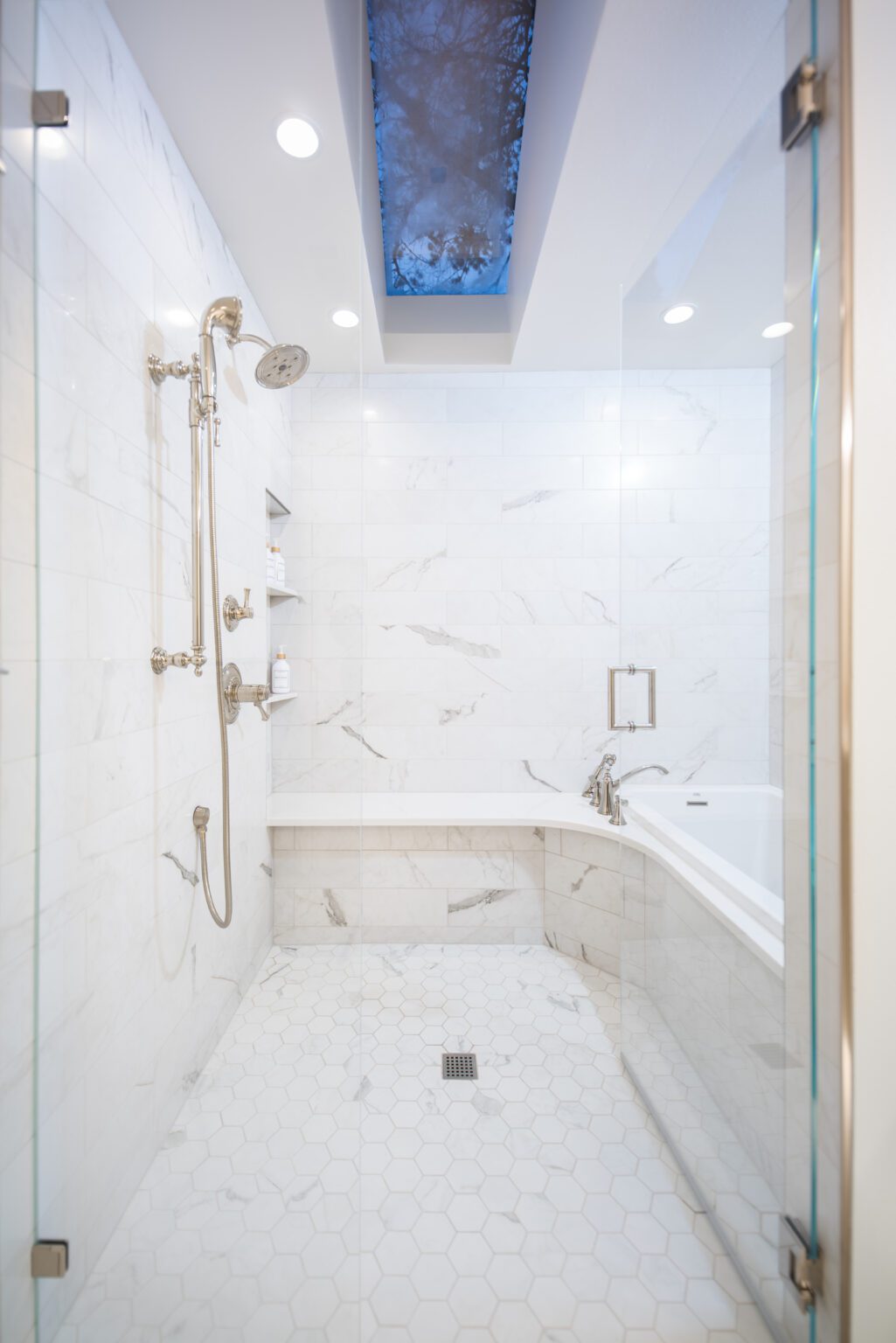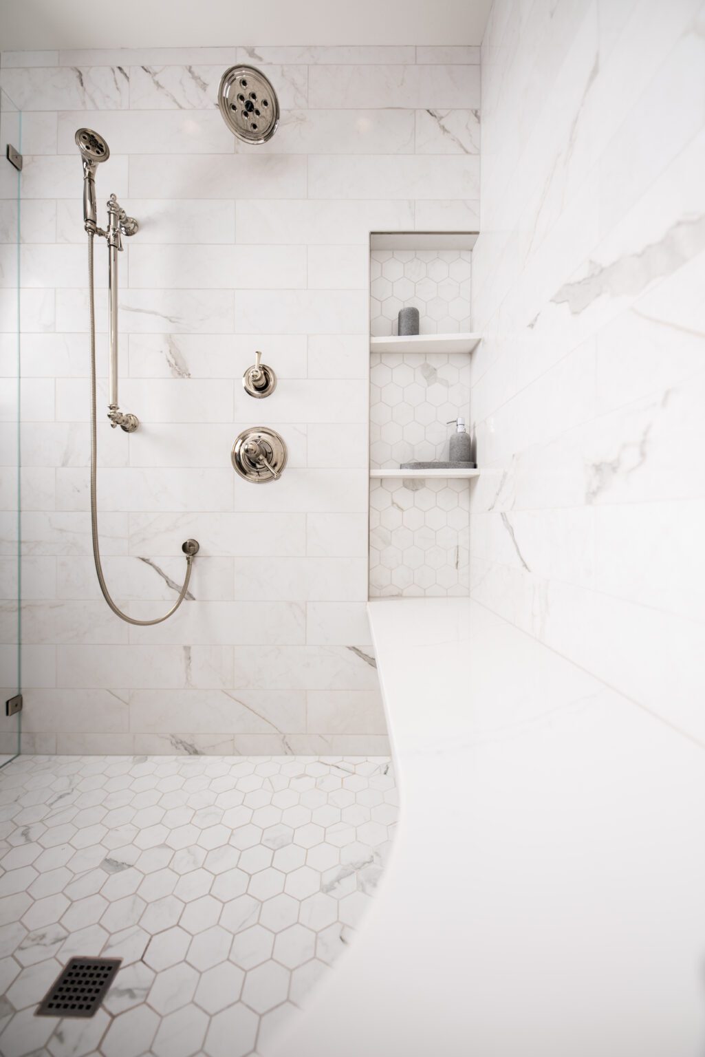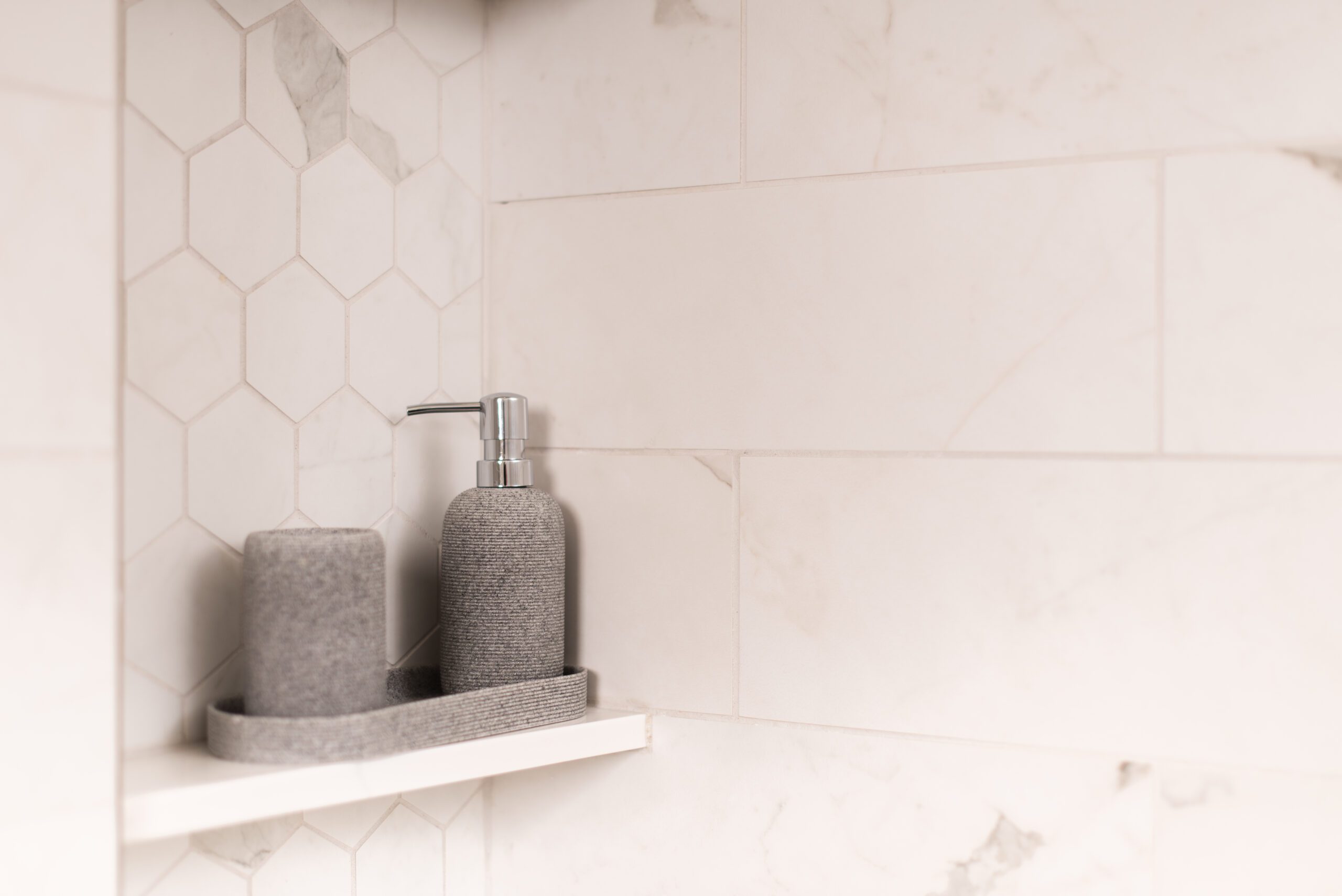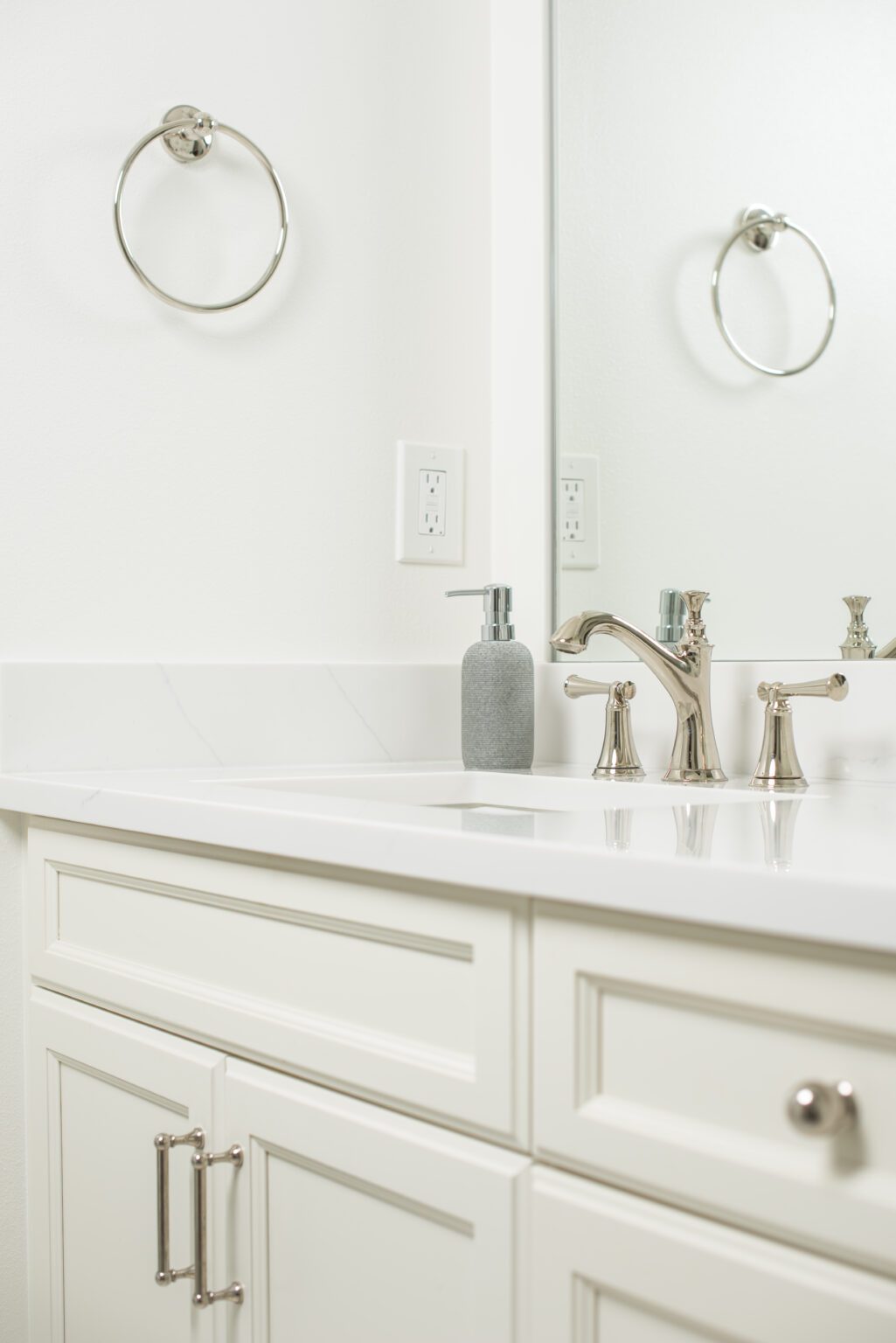 The bathroom remodeling project exemplifies modern elegance. Featuring Silestone countertops expertly fabricated and installed by Granite and Marble Specialties, this bathroom combines style and durability. Belmont cabinets offer practical and chic storage solutions, complemented by contemporary lighting fixtures from Modern Forms and Avenue Lighting.