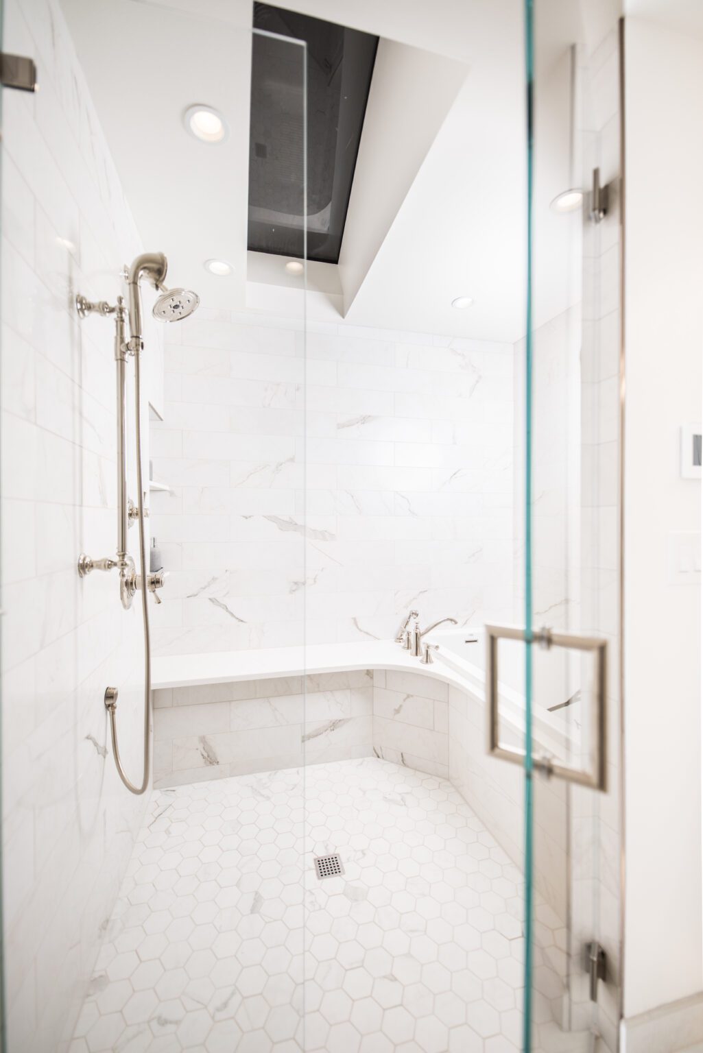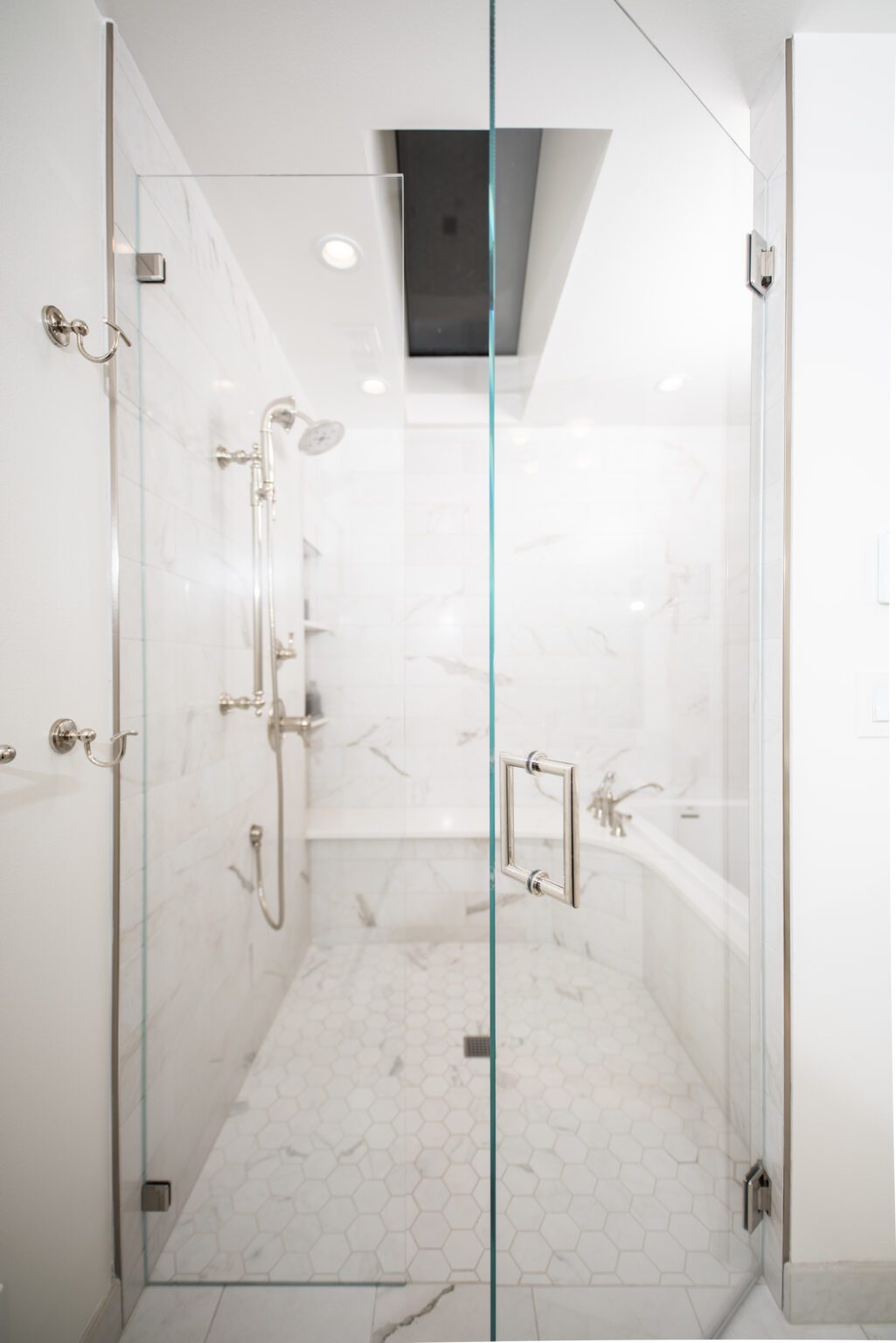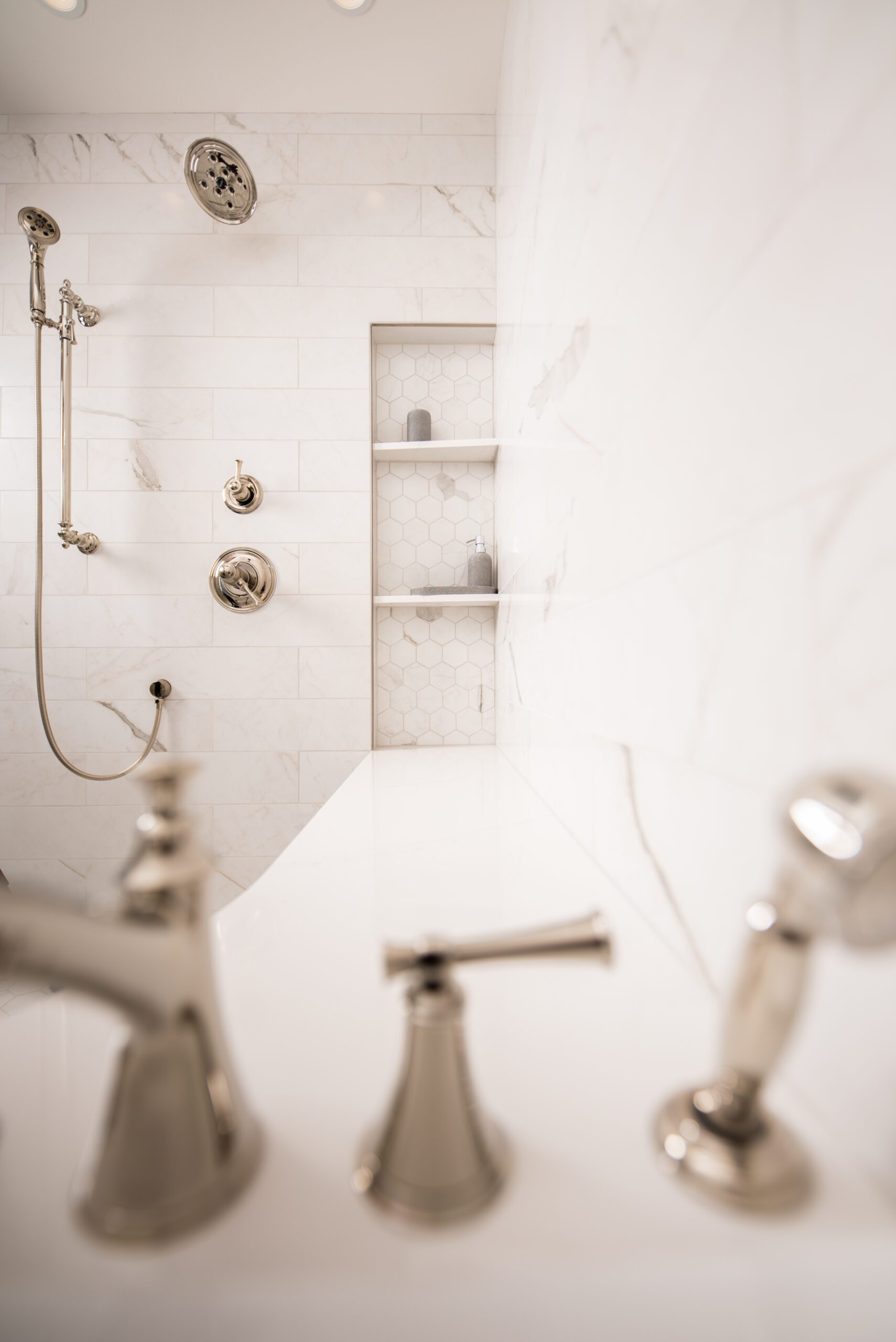 Distinctive mirrors from Seattle’s Distinctive Glass add a touch of sophistication. Tile that replicates the pattern of natural stone from United Tile provide a sleek and refined look. High-end Brizo faucets, a Toto bidet toilet, and Kohler bathtub and sinks complete the transformation, creating a bathroom that is both functional and aesthetically pleasing.