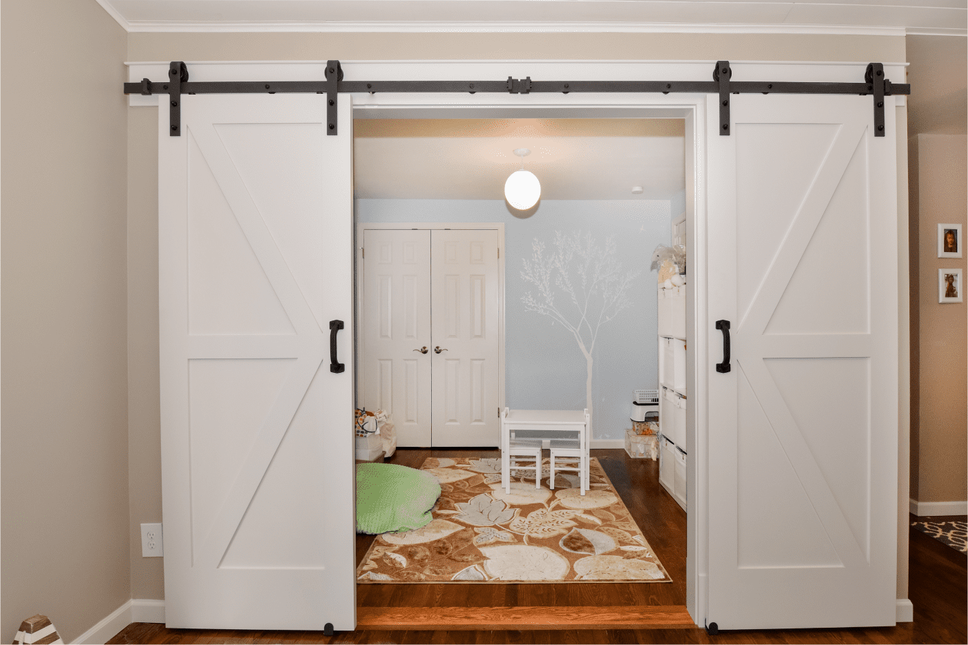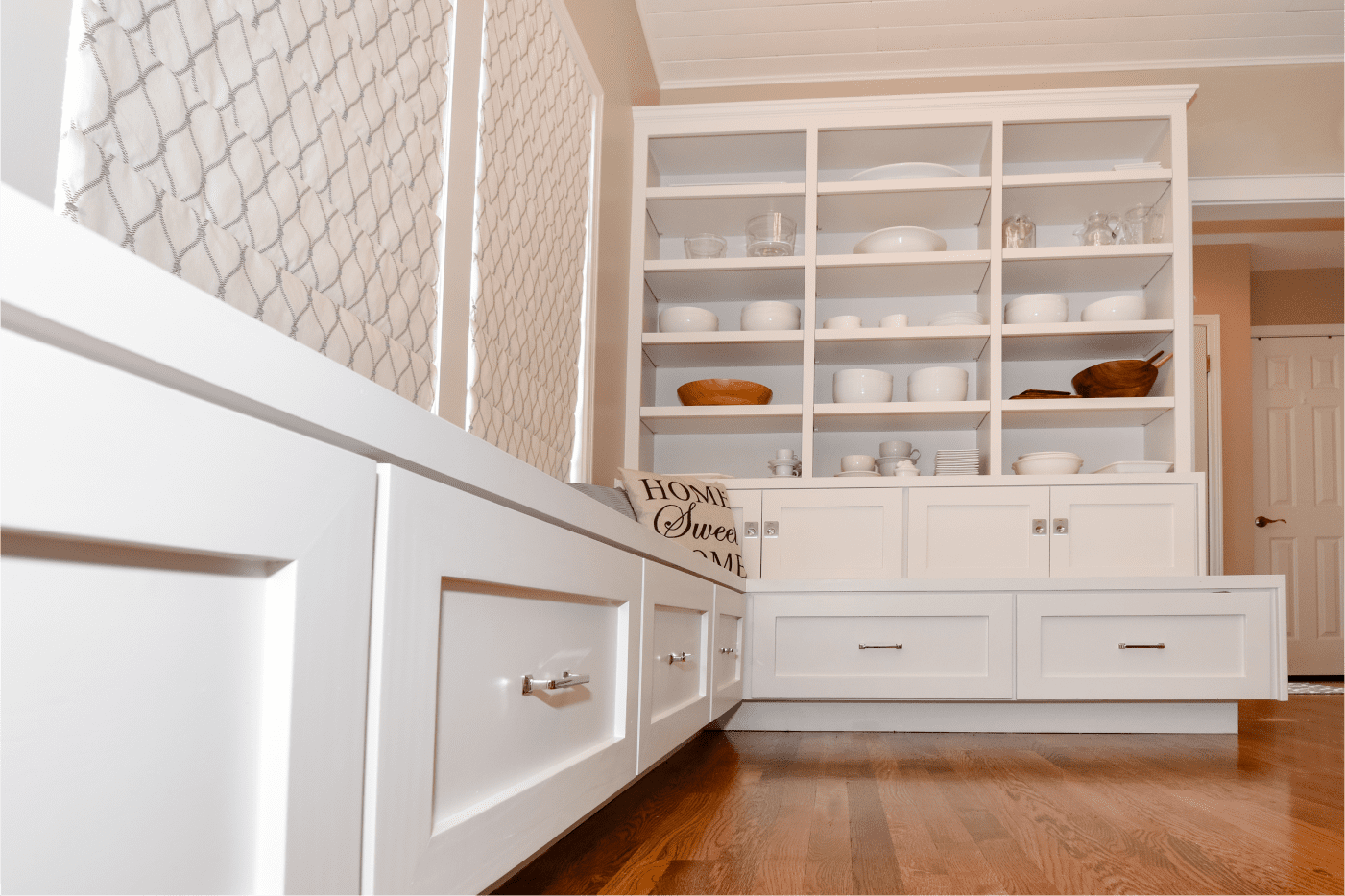 Kitchen remodeling project includes the addition of a swing door that separates the child’s room from the kitchen-living area. When fully opened, the door allows for seamless integration of the spaces, creating a flexible layout that can be easily adjusted to suit different needs. The kitchen-living area features an L-shaped bench along the cabinets, with open shelves for storing kitchen essentials and decorative items. The design is executed in light tones, complemented by wooden flooring and a wooden dining table, offering both functionality and a warm, cohesive aesthetic.
