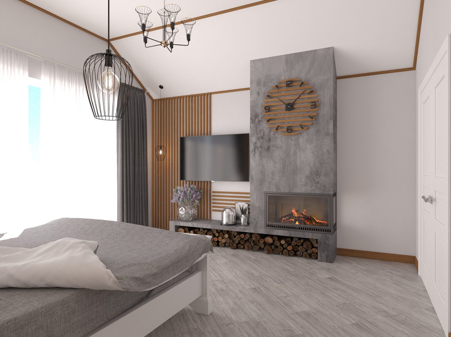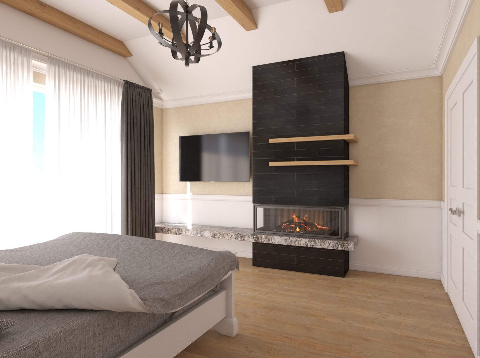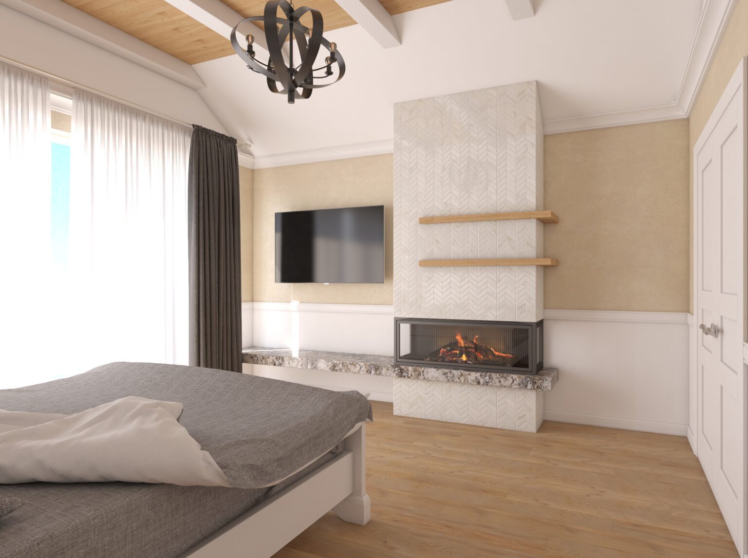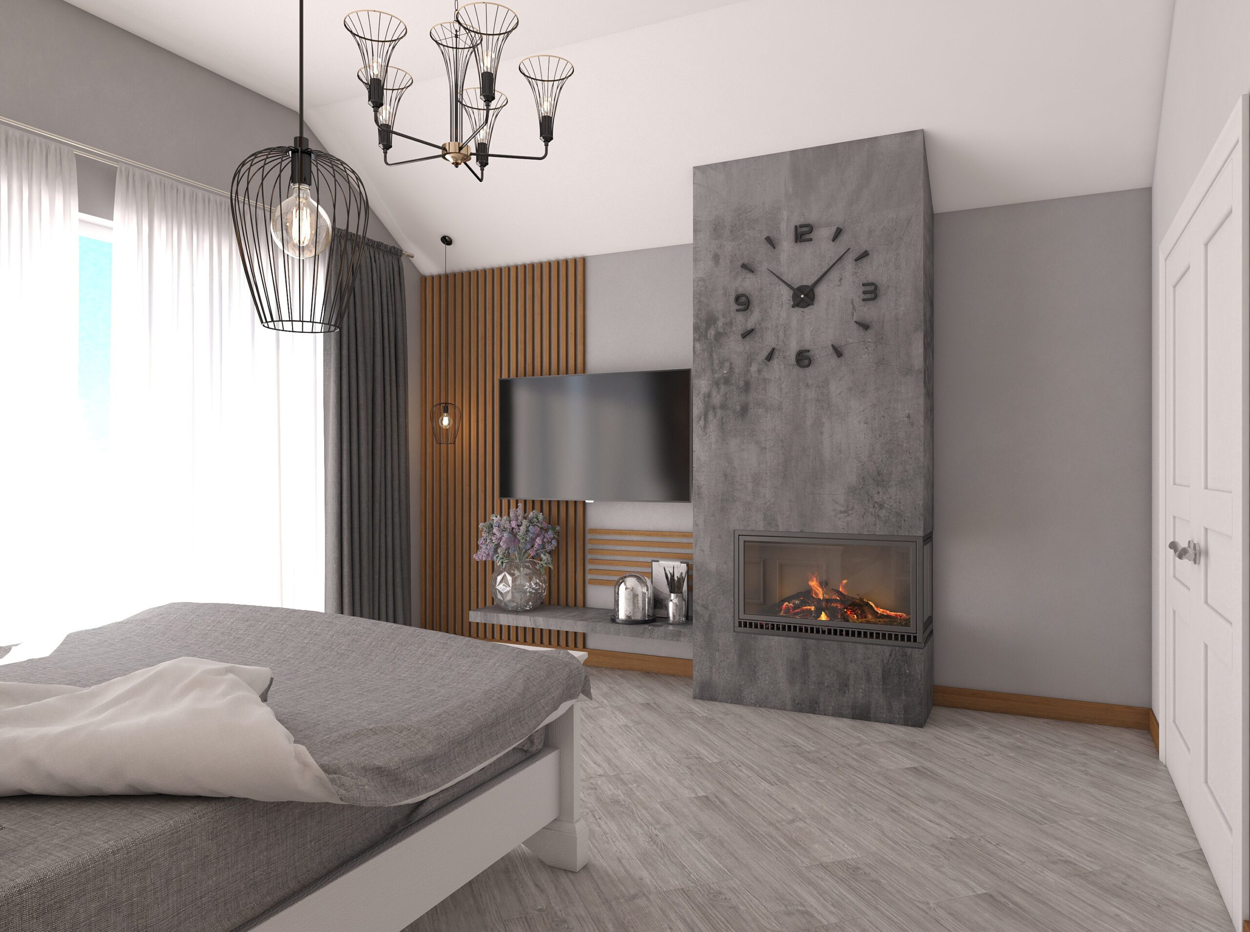 In this bedroom remodel, we crafted a new interior design project from scratch, with the highlight being a fireplace zone that became the focal point of the room, adding warmth and coziness. We seamlessly integrated a TV on the fireplace wall, allowing you to enjoy watching your favorite shows while relaxing in bed and admiring the mesmerizing fire.