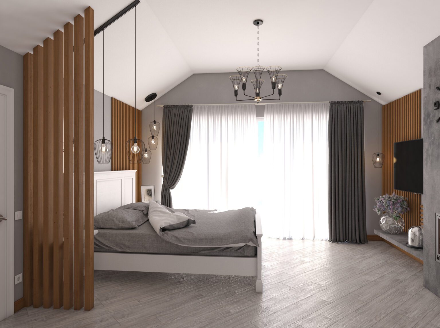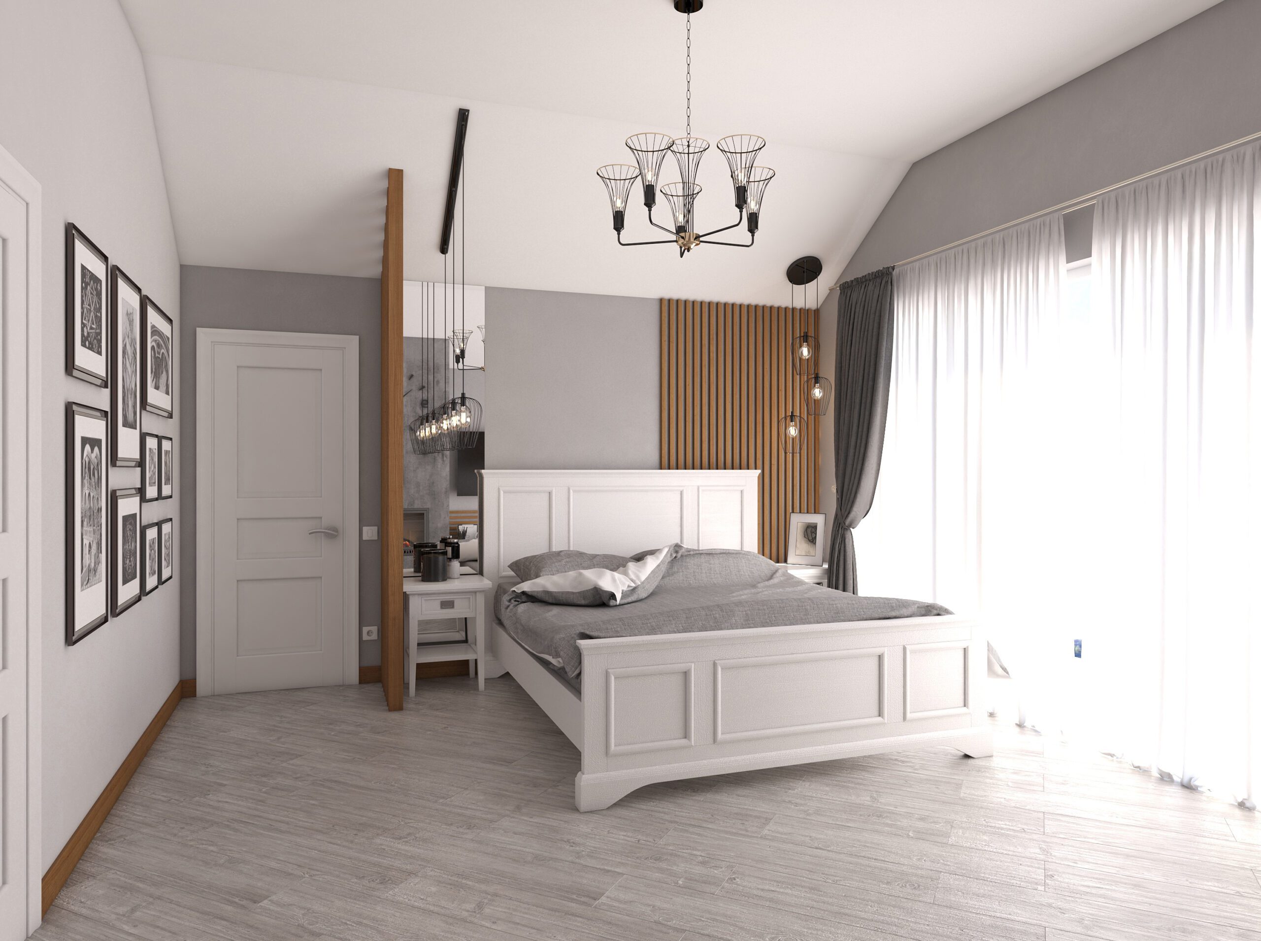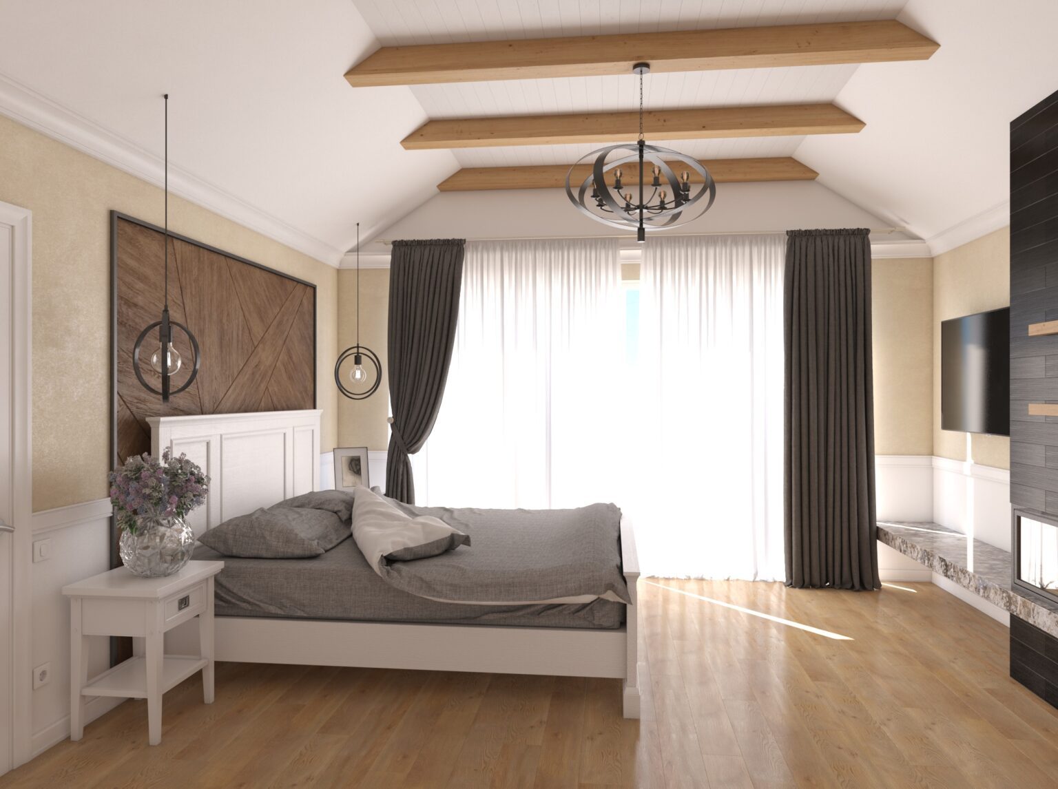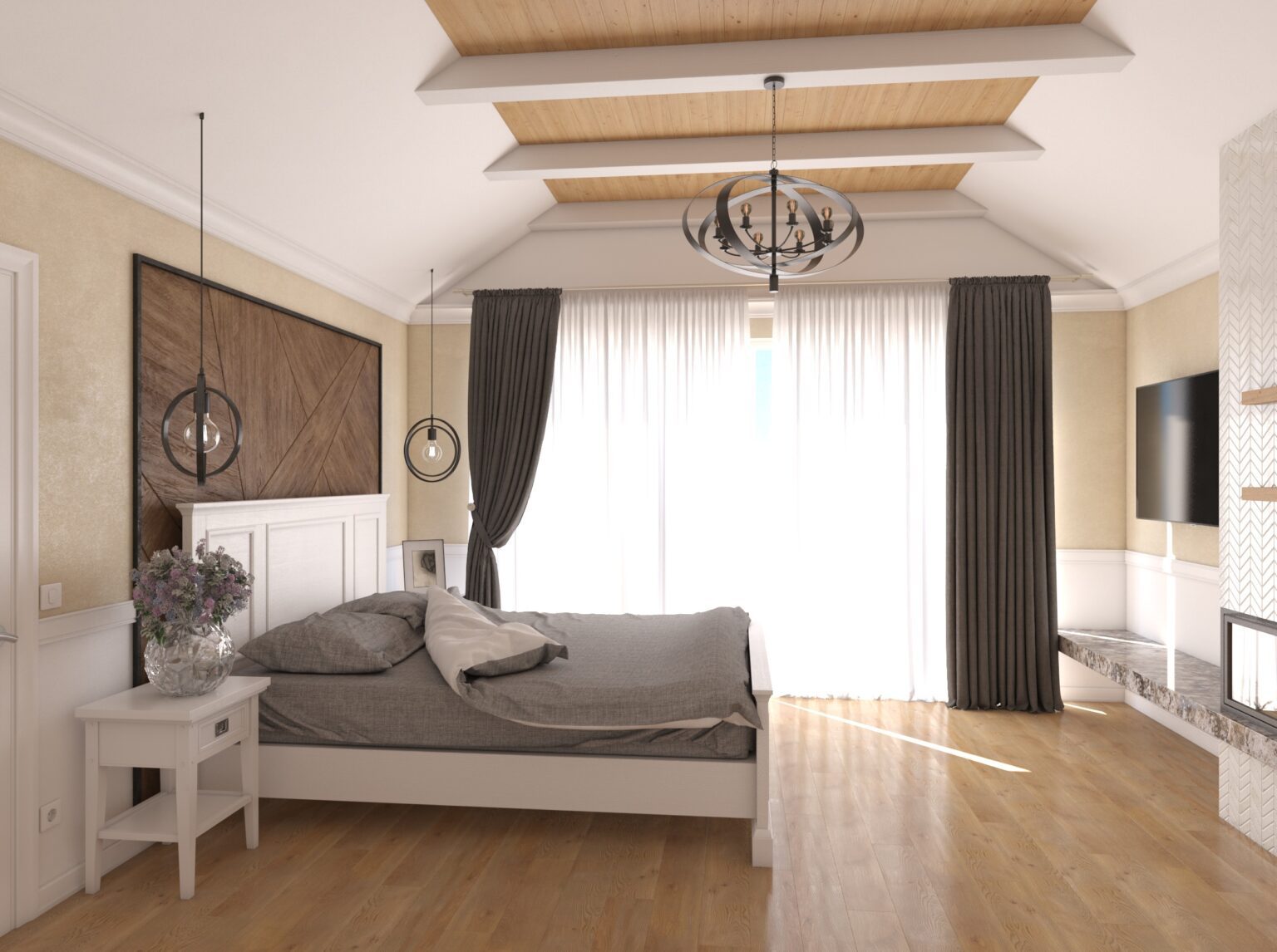 In this bedroom remodel, we crafted a new interior design project from scratch, with the highlight being a fireplace zone that became the focal point of the room, adding warmth and coziness. We seamlessly integrated a TV on the fireplace wall, allowing you to enjoy watching your favorite shows while relaxing in bed and admiring the mesmerizing fire.