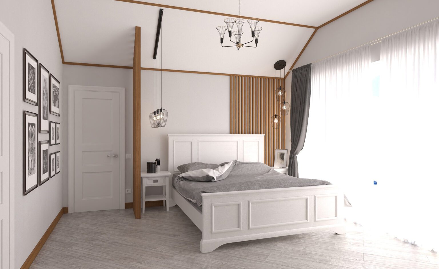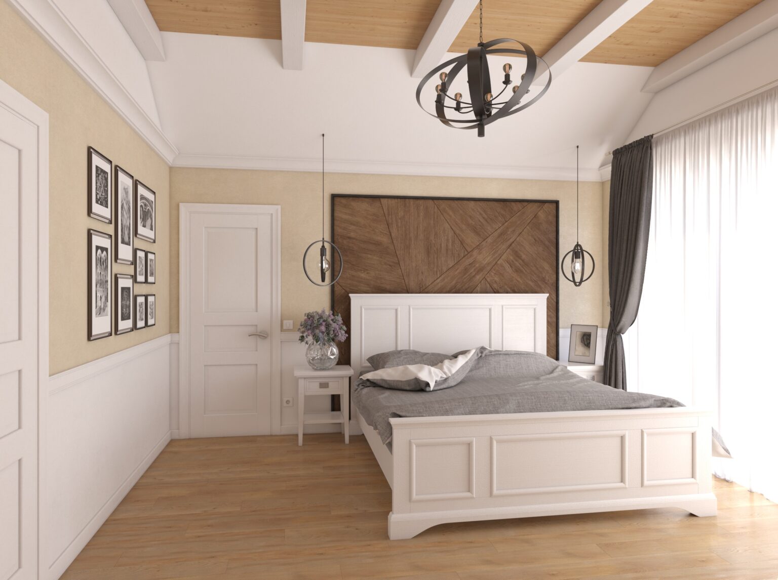 Another standout feature is the ceiling, designed with wooden elements reminiscent of a ship’s deck, adding a unique touch of character. The rest of the interior is executed in neutral, calming tones, balancing the accent areas and creating a harmonious, serene environment.